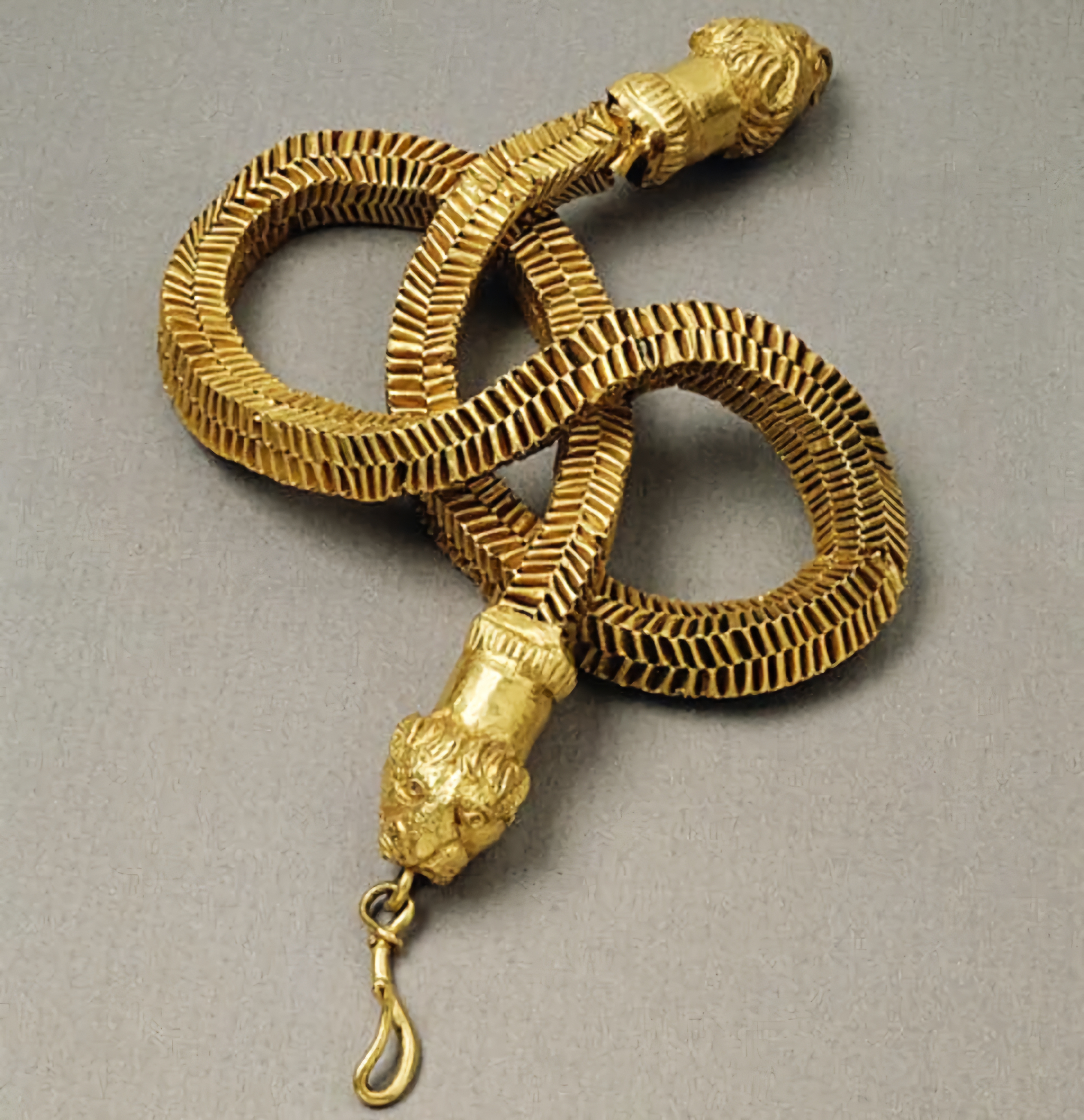 사자 머리 잠금장치와 접힌 금박 체인이 있는 로마시대 목걸이다.