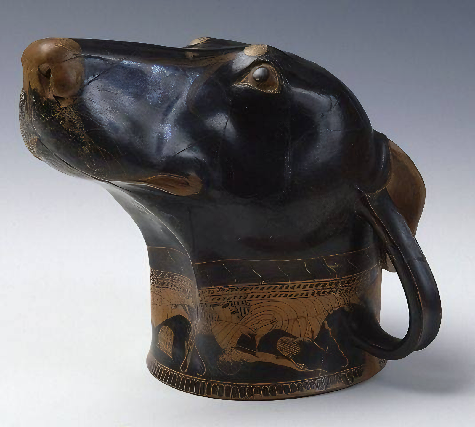 이탈리아 비테르보Viterbo 지방 팔레리Falerii에서 발견된 기원전 5세기 초 에트루리아 시대 개 머리 모양 리톤rhyton이다.