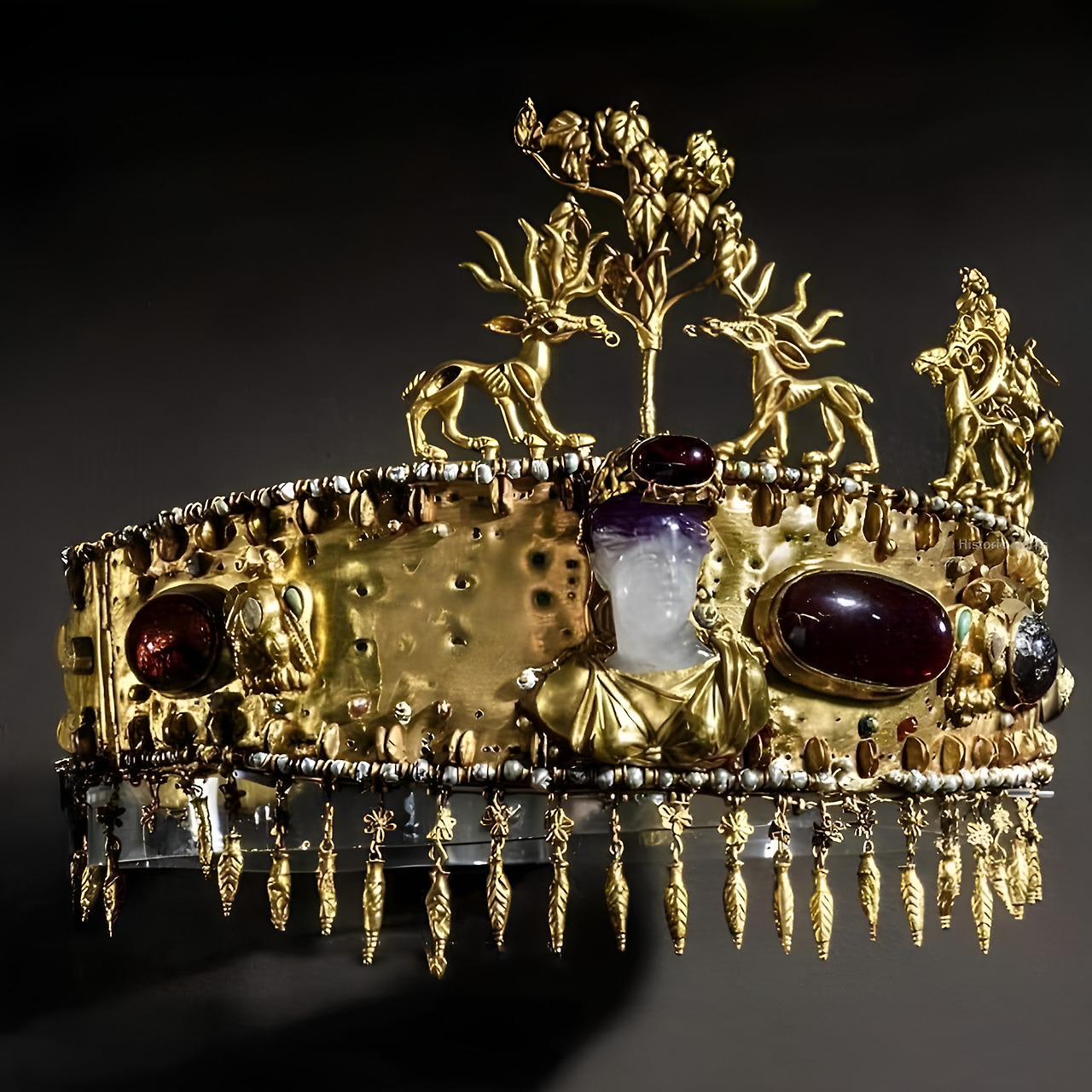 스키타이와 그리스 영향을 혼합한 이 왕관은 그리스 식민지와 흑해 주변 유목민 대초원 문화이 어떤 상호 작용을 일으켰는지를 잘 보여준다.