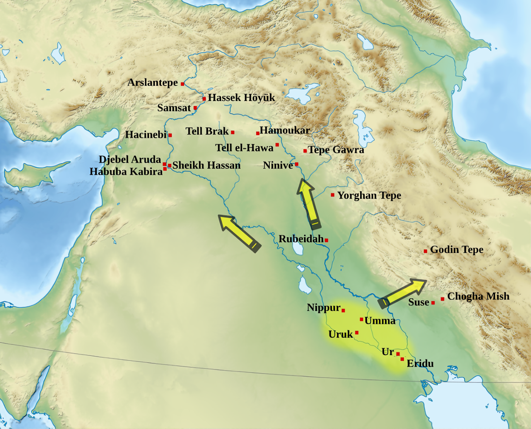 기원전 6,500년에서 4,000년 사이에 이곳은 혁신, 문화, 거버넌스의 중심지로 번성했으며 선구적인 기념비적 건축물, 복잡한 행정, 최초의 알려진 문자 체계인 설형 문자 cuneiform 를 개척했다.