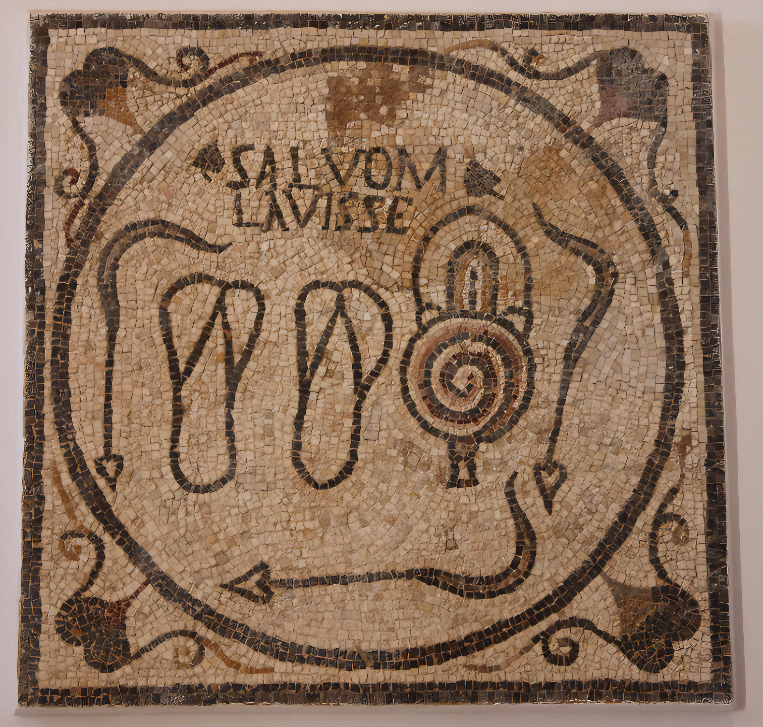 목욕 샌들을 보여주는 로마 모자이크 목욕 표지판이다.