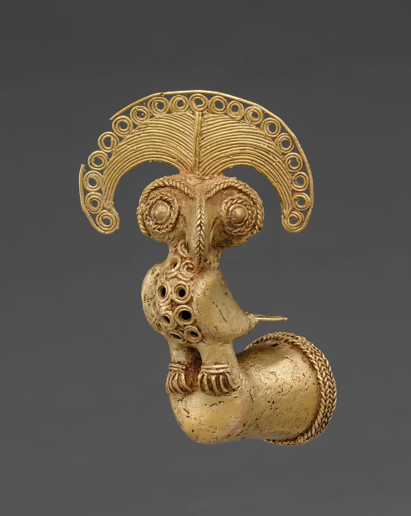 아마도 1,000년 전에 만들어졌을 것으로 추정되는 이 새 장식은 현재 콜롬비아 이스트미아 지역에서 번성한 제누Zenú 문화에서 비롯한다.