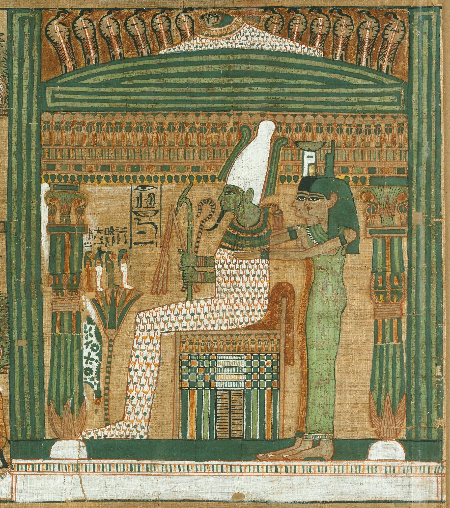 신전 왕좌에 앉은 신 오시리스Osiris를 묘사한다.