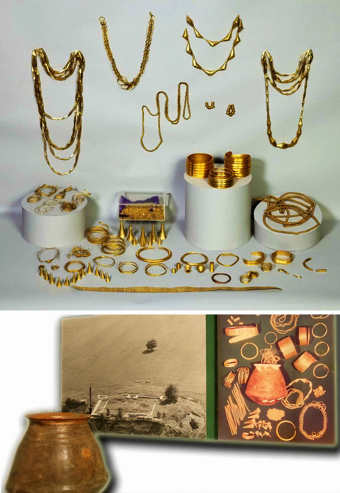 이 보물은 선사시대 비트론코닉 모양 점토 용기bitronconic-shaped clay vessel에 담겨 있었는데, 이 그릇은 높이는 17cm이고 가장자리는 약간 벌어져 있으며 홈grooves으로 장식되어 있었다.