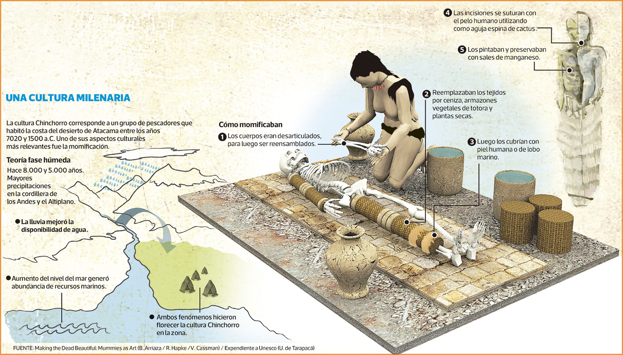 해안 건조 지역에 담수가 존재했으로 인간 정착 환경이 형성됐다. 친초로족은 세밀한 미라화와 장례 관습으로 유명하다.