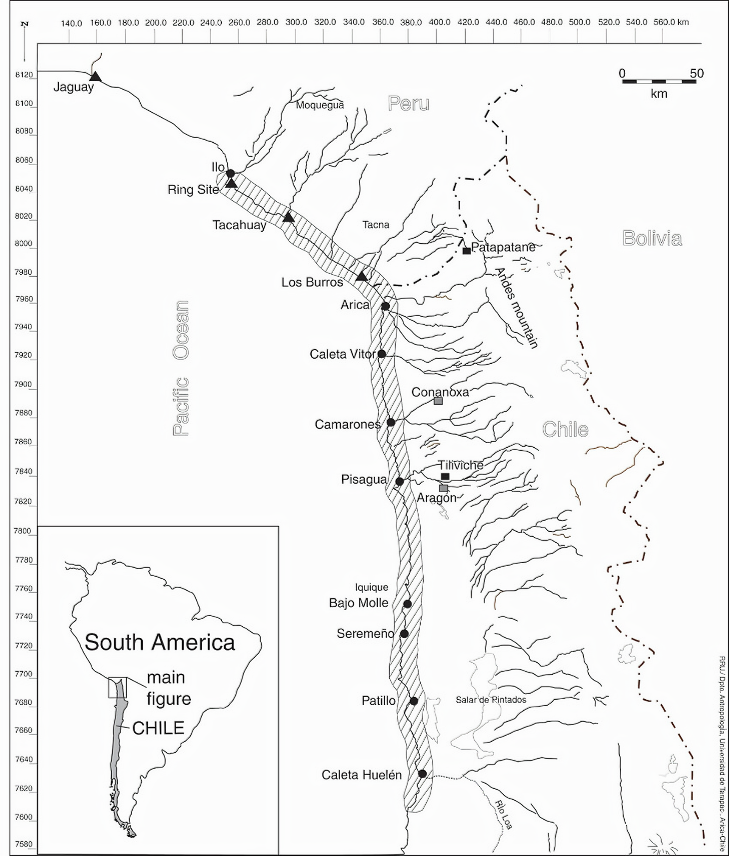 하지만이 문화 핵심은 남쪽 해안 도시 아리카Arica 와 칼레타 카마로네스Caleta Camarones 사이에 뻗어 있는 칠레 아리카-카마로네스Chilean Arica-Camarones 지역인 듯하다. 이 주변에 많은 관련 유적이 있다.