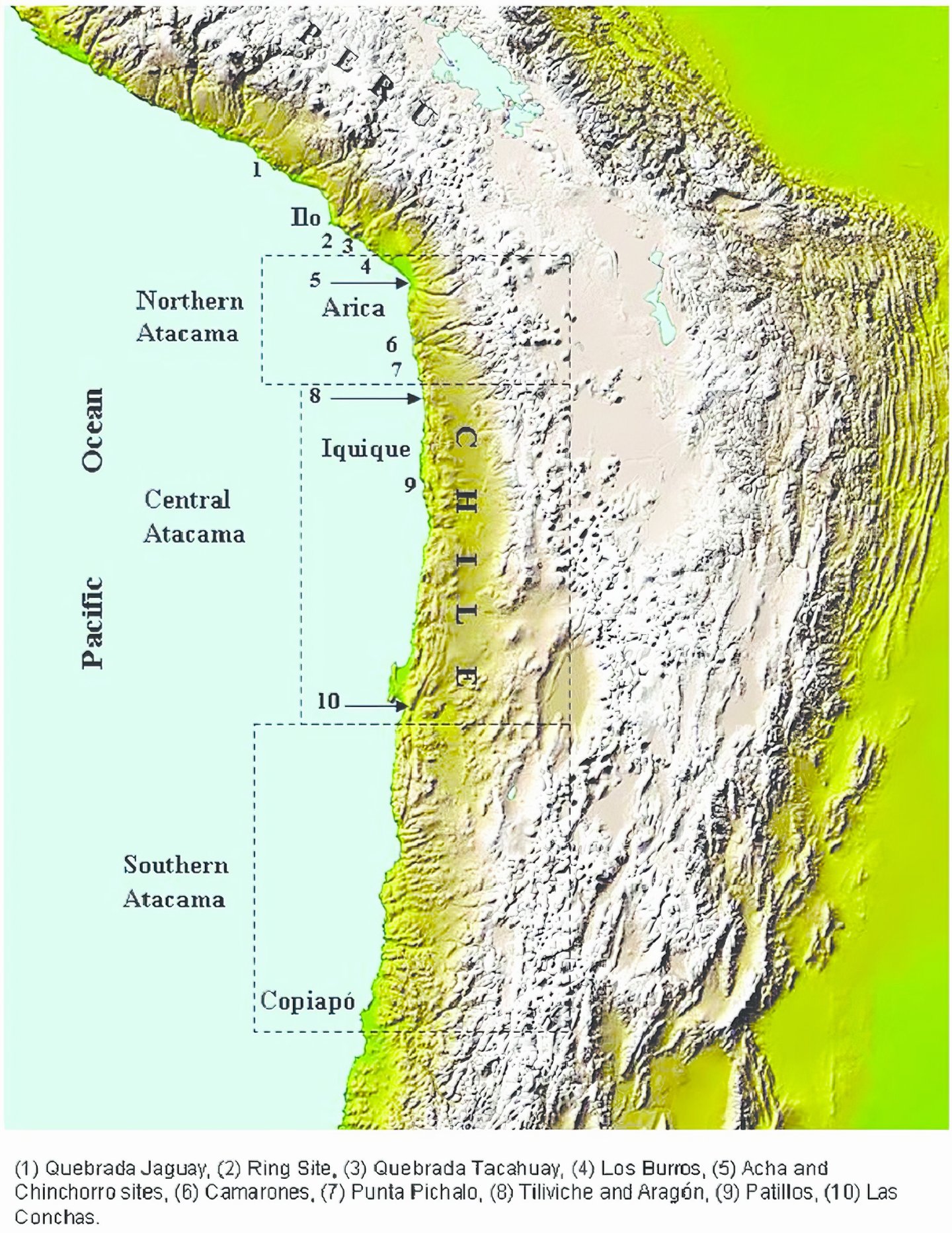 해안을 따라 가장 초기 유적이 많이 발견됐다. 페루에서는 케브라다 타카와이Quebrada Tacahuay와 케브라다 하구아이Quebrada Jaguay가 많이 조사됐다. 더 남쪽에는 링 유적Ring site과 케브라다 로스 부로스Quebrada Los Burros가 있다. 이들 유적은 대부분 후기 플라이스토세late Pleistocene와 초기 홀로세early Holocene 시대(기원전 11,000~9000년경)로 거슬러 올라간다. 칠레 내륙에는 칠레의 아차스Achas와 라스 콘차스Las Conchas 유적도 있다.