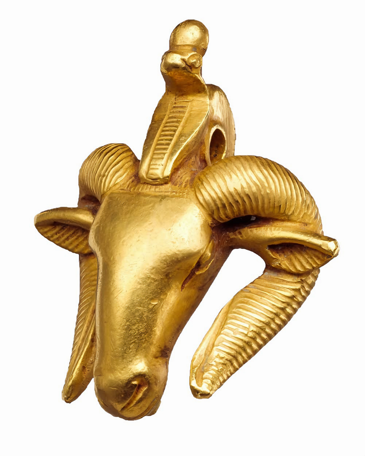 이는 두꺼운 끈에 부착되어 목 뒤에 매듭이 지어져 있고 어깨 위에서 앞으로 늘어뜨려졌을 더 작은 숫양의 머리에서 끝났을 것이다.