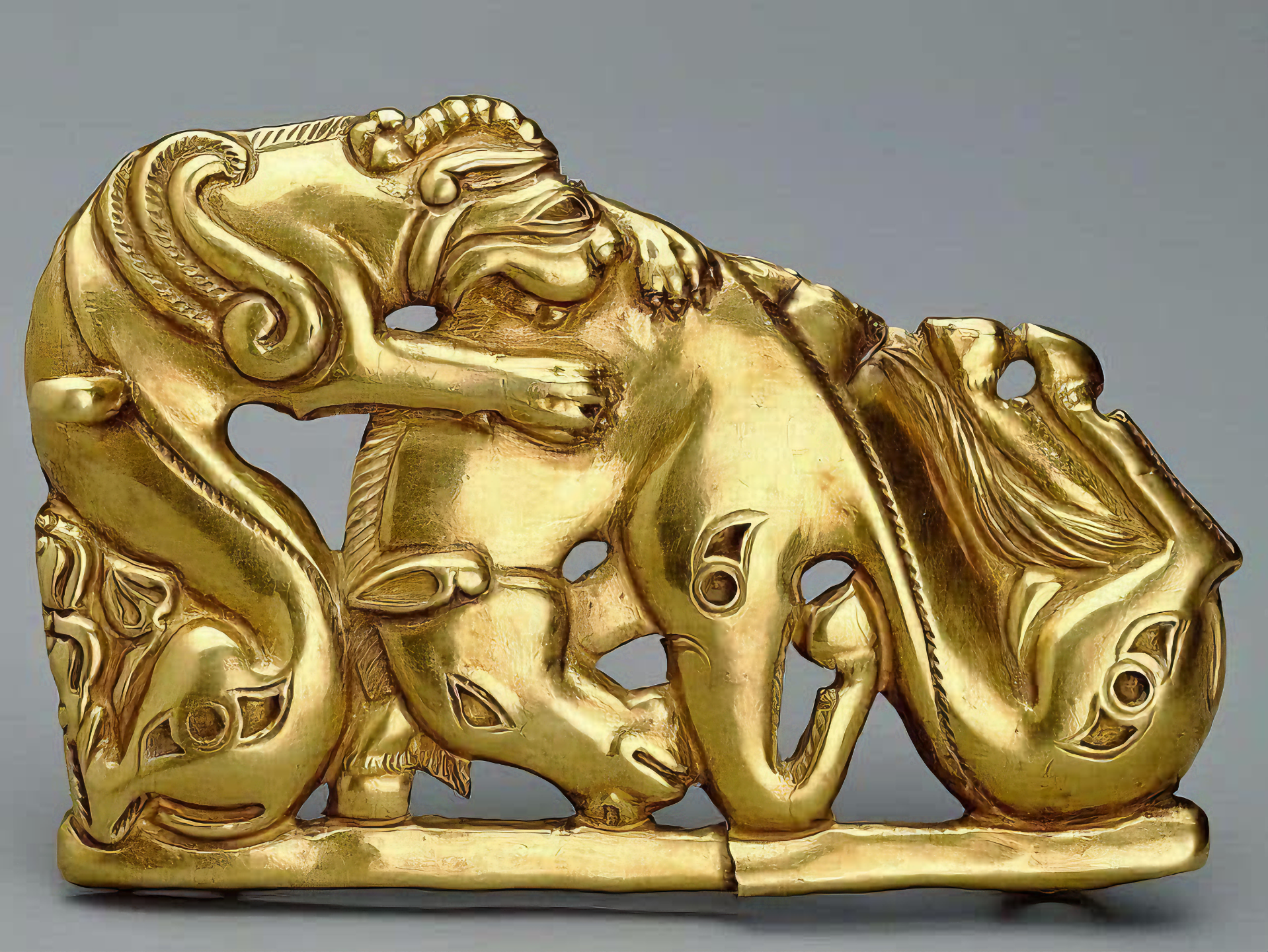 A Scythian gold belt plaque depicting a griffin attacking a horse.