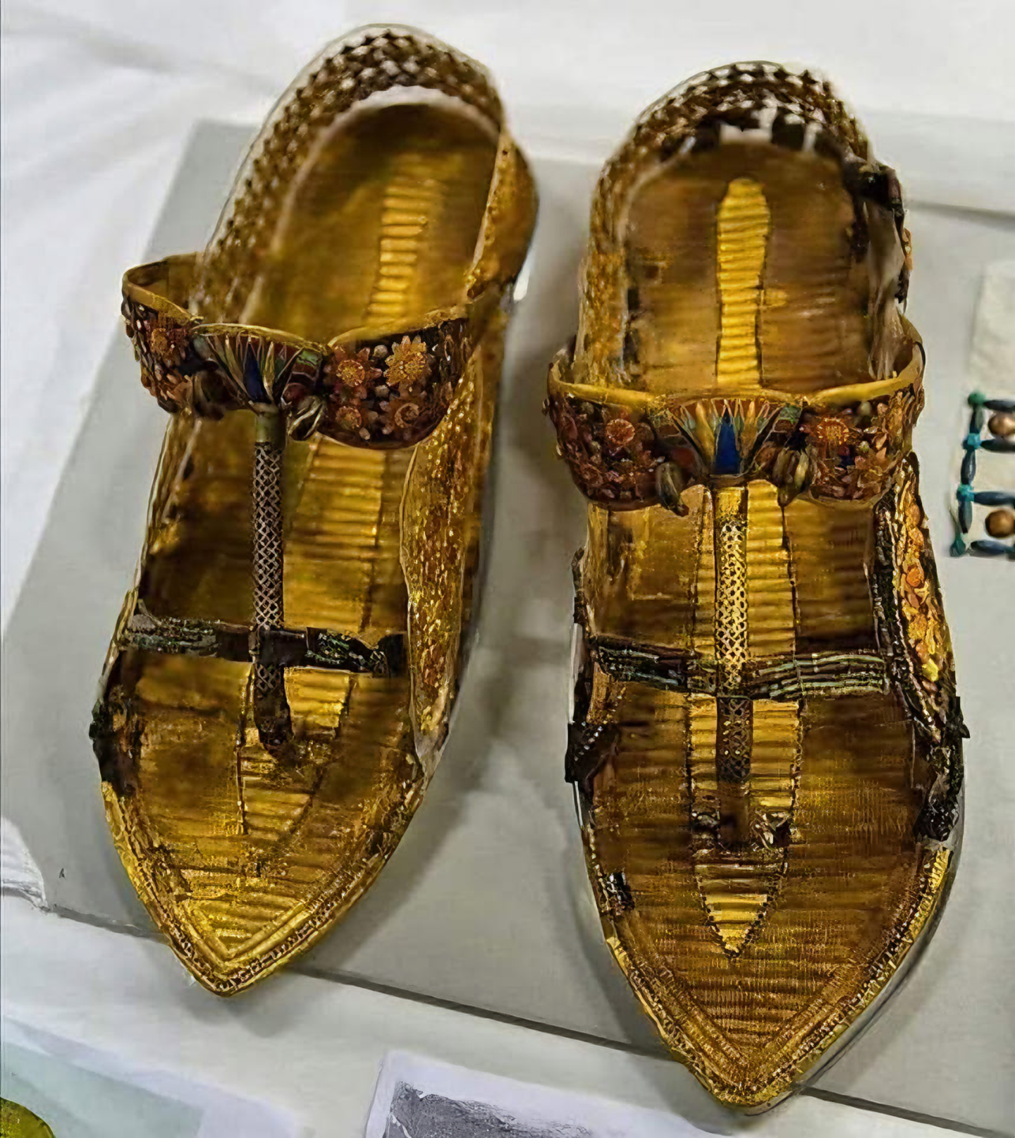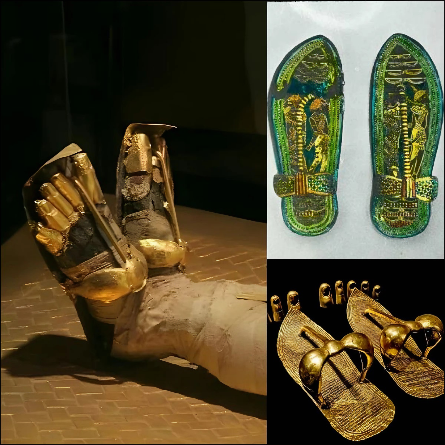 Golden sandals and golden toe caps were found at the feet of King Tutankhamun, symbolizing his high status and possibly providing him protection and power in the afterlife.