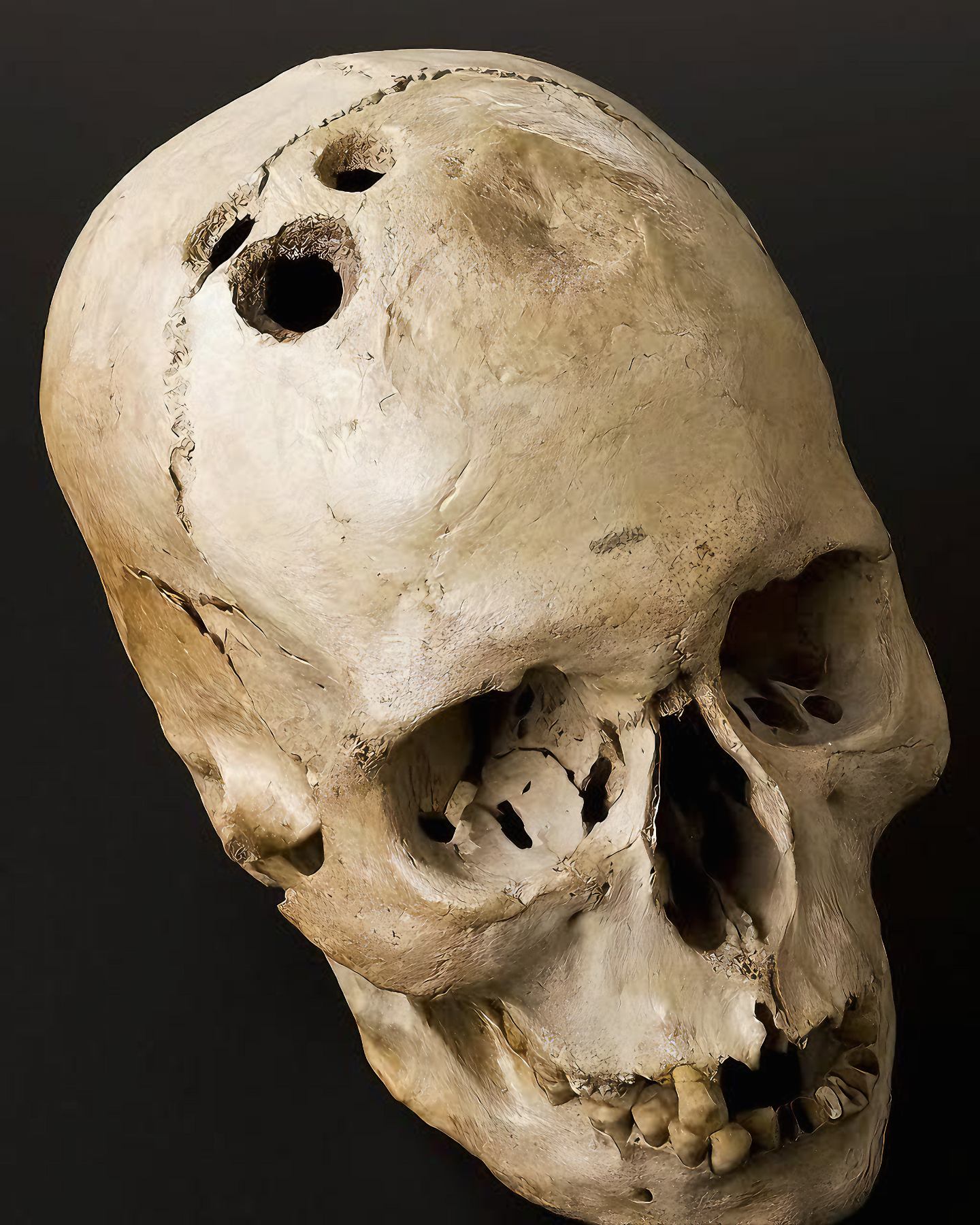 이 남성 두개골은 두개골을 의도적으로 뚫은 천공술(trepanation) 흔적을 보여준다.