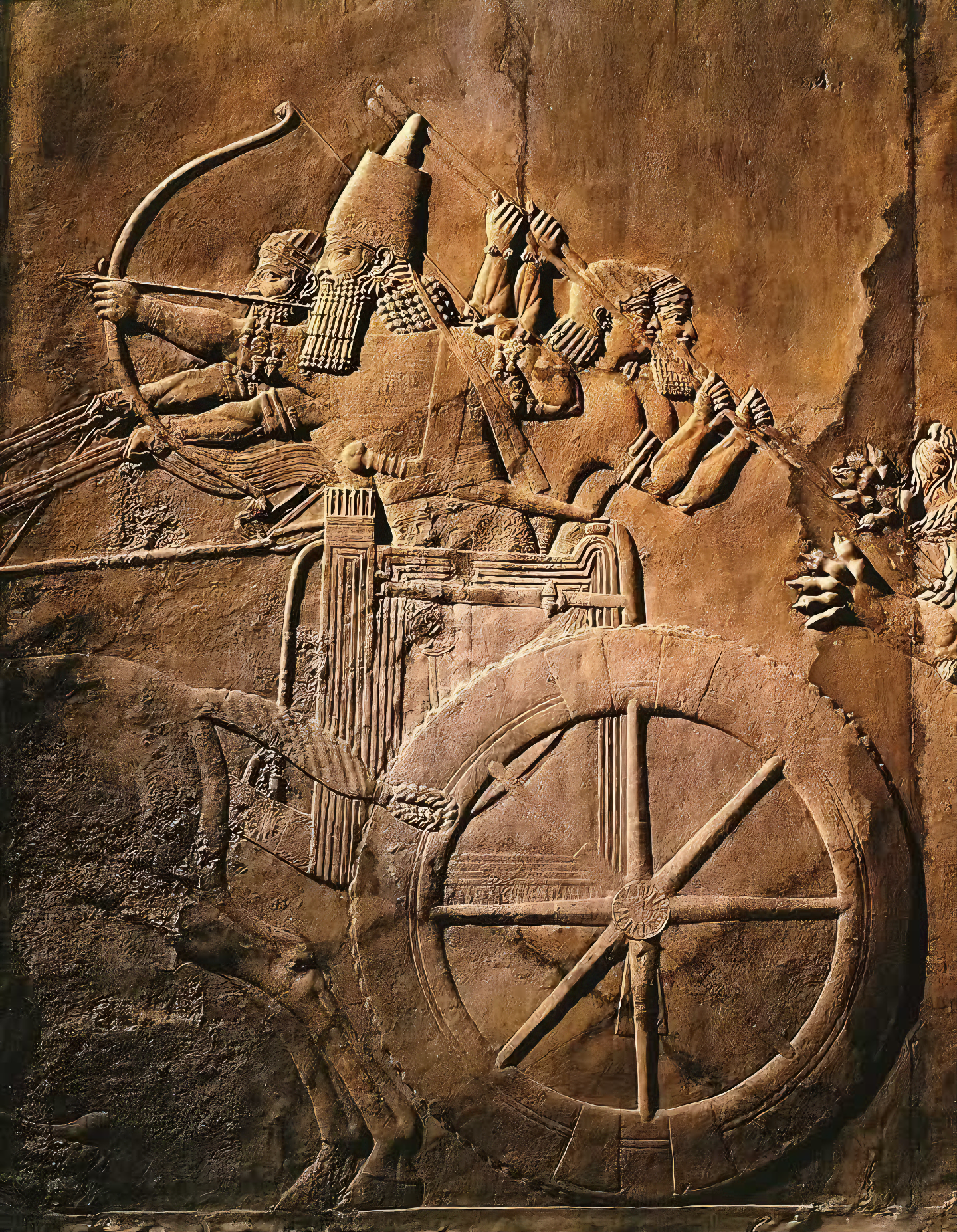 #아시리아 마지막 이 위대한 왕은 그의 전차에서 사자를 사냥한다.