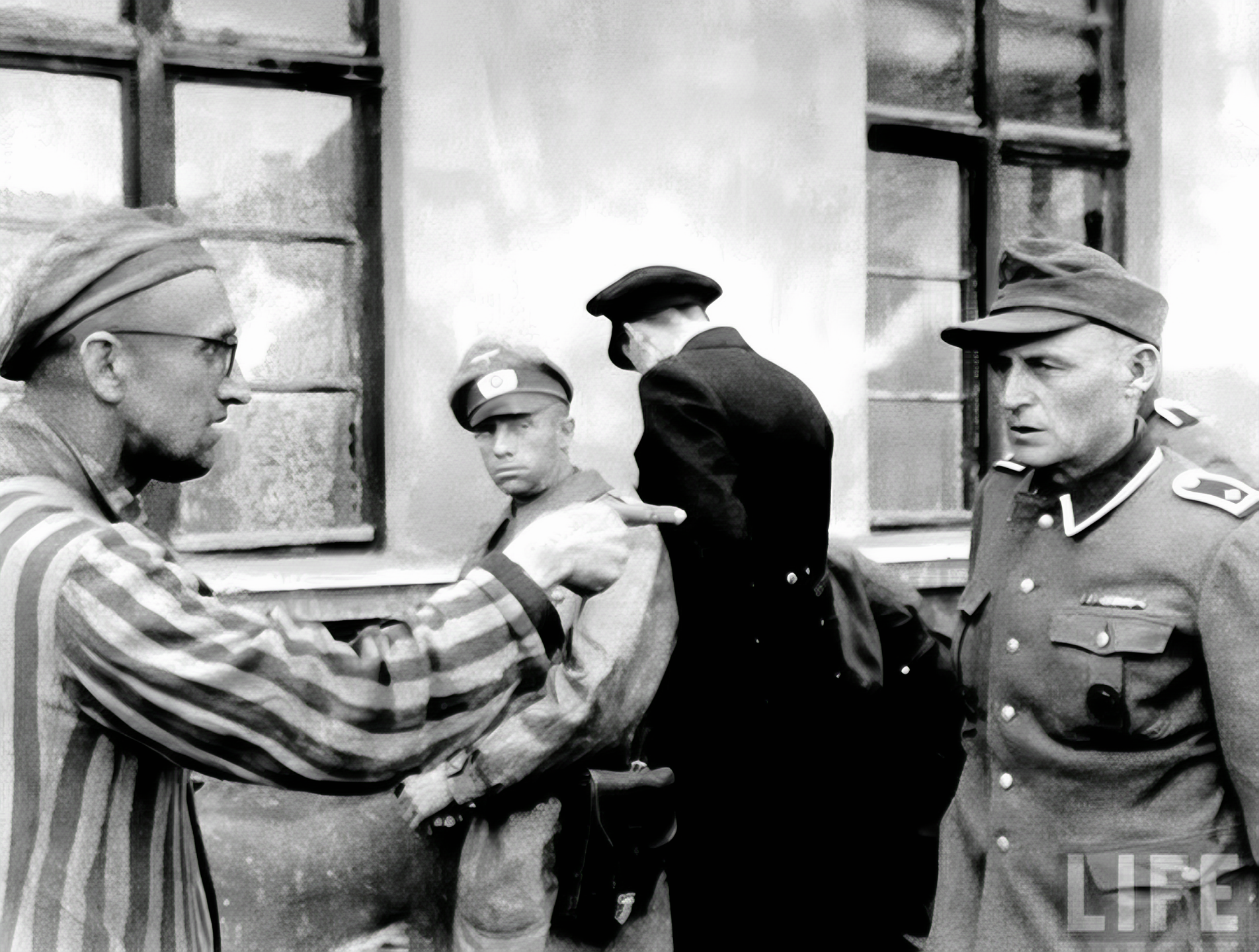미 제3기갑사단이 미텔브라우-도라 수용소를 해방시킨 직후 죄수들을 잔인하게 구타한 간수를 죄수복을 입은 한 노예 노동자가 손가락질을 하는 장면이라고.