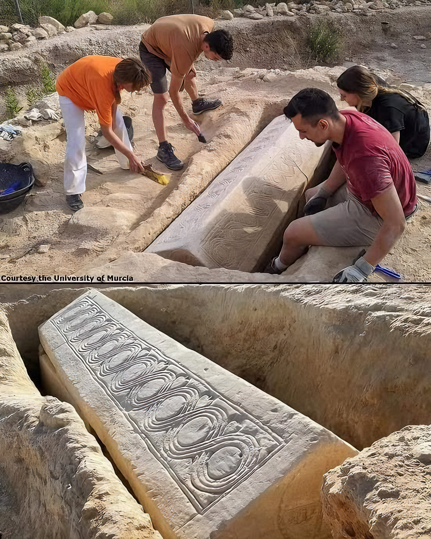 스페인 남부 로스 비야리코스Los Villaricos에서 로마 유적을 발굴하던 연구원들이 기하학적 무늬geometric patterns와 서로 얽힌 담쟁이 잎 interlocking ivy leaves을 장식한 2m 길이 석관coffin 하나를 발견했다.