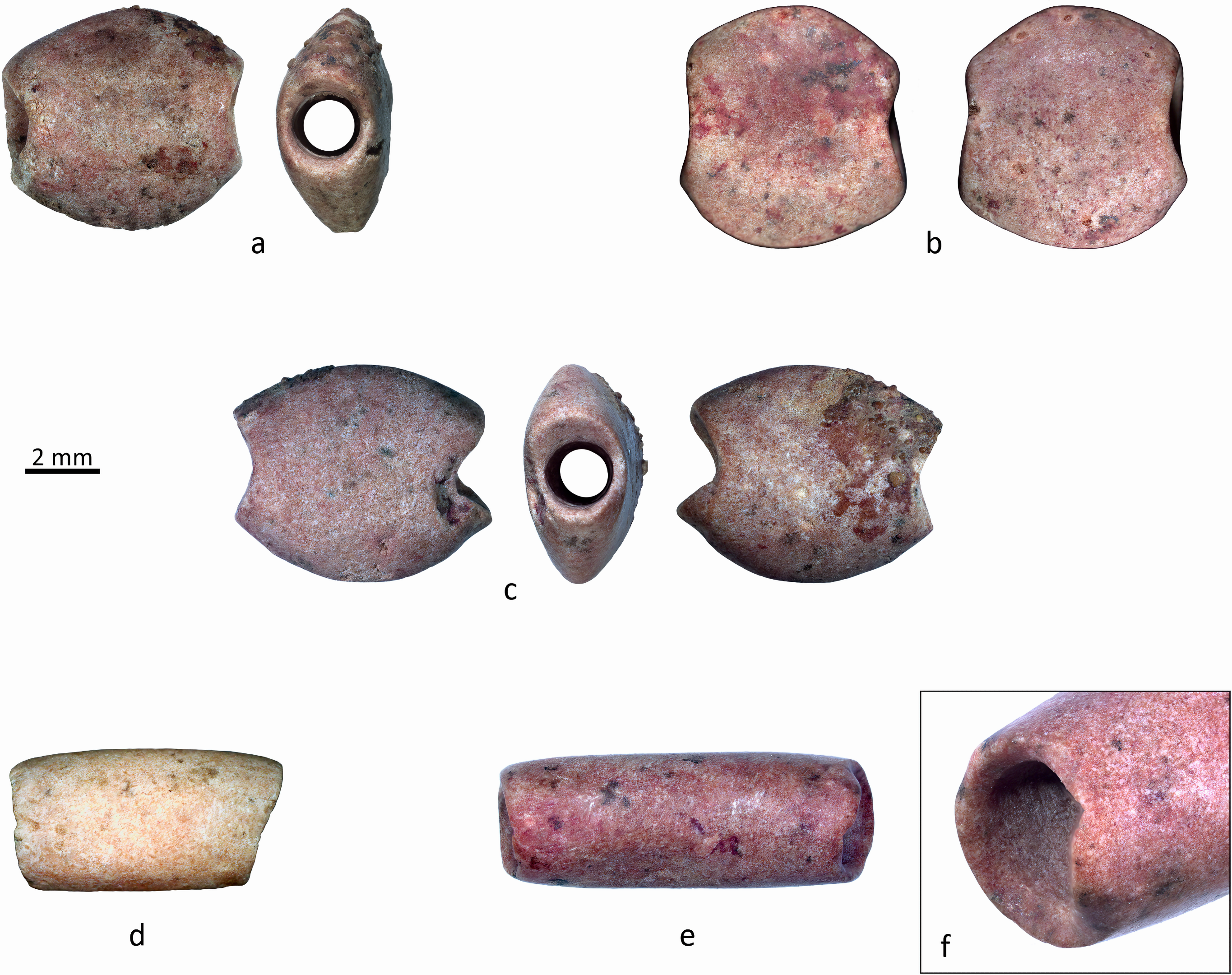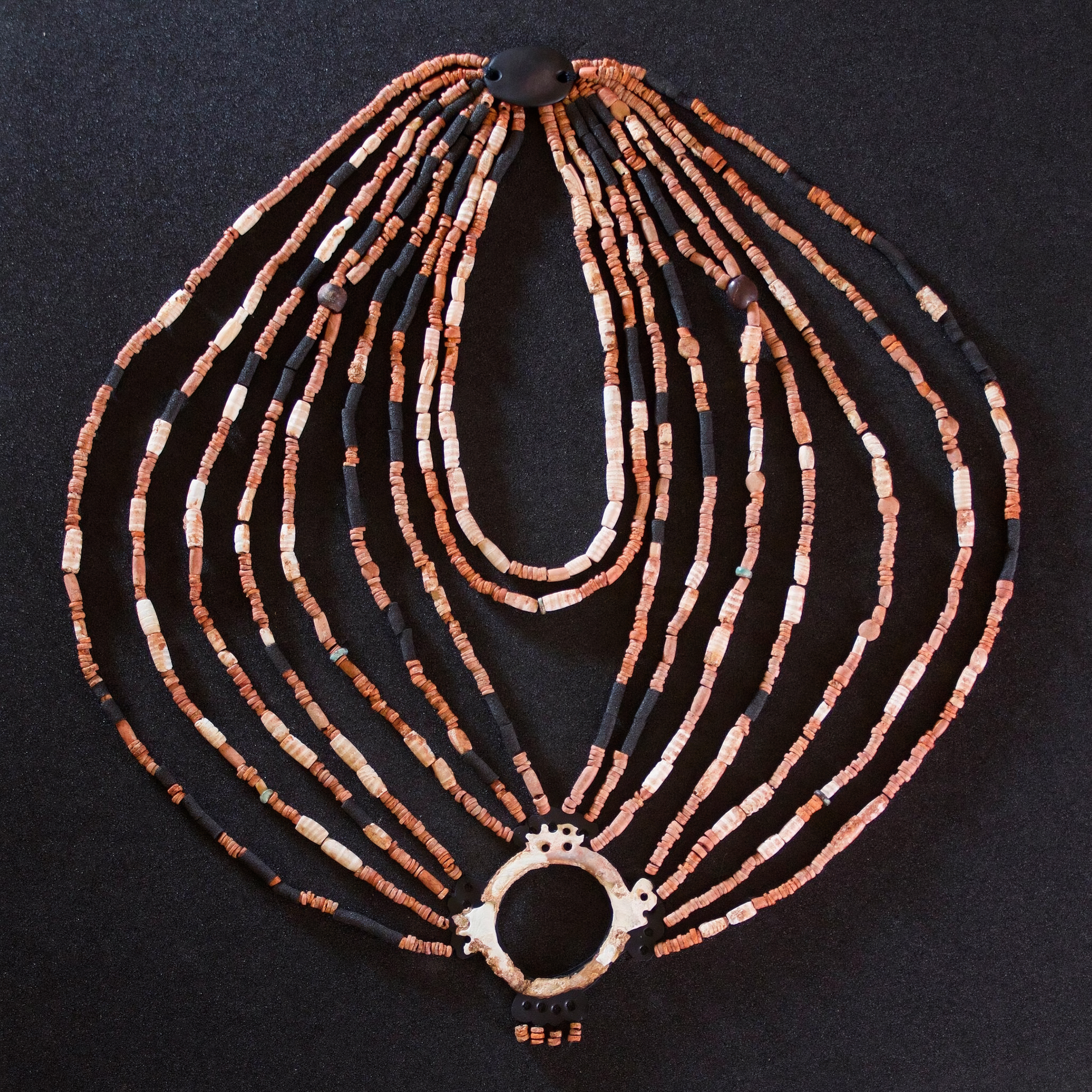 요르단 남부 농촌 마을인 바자Ba’ja에서 발견된 기원전 7400~6800년 무렵 한 아이 무덤에서 나온 목걸이라 한다.