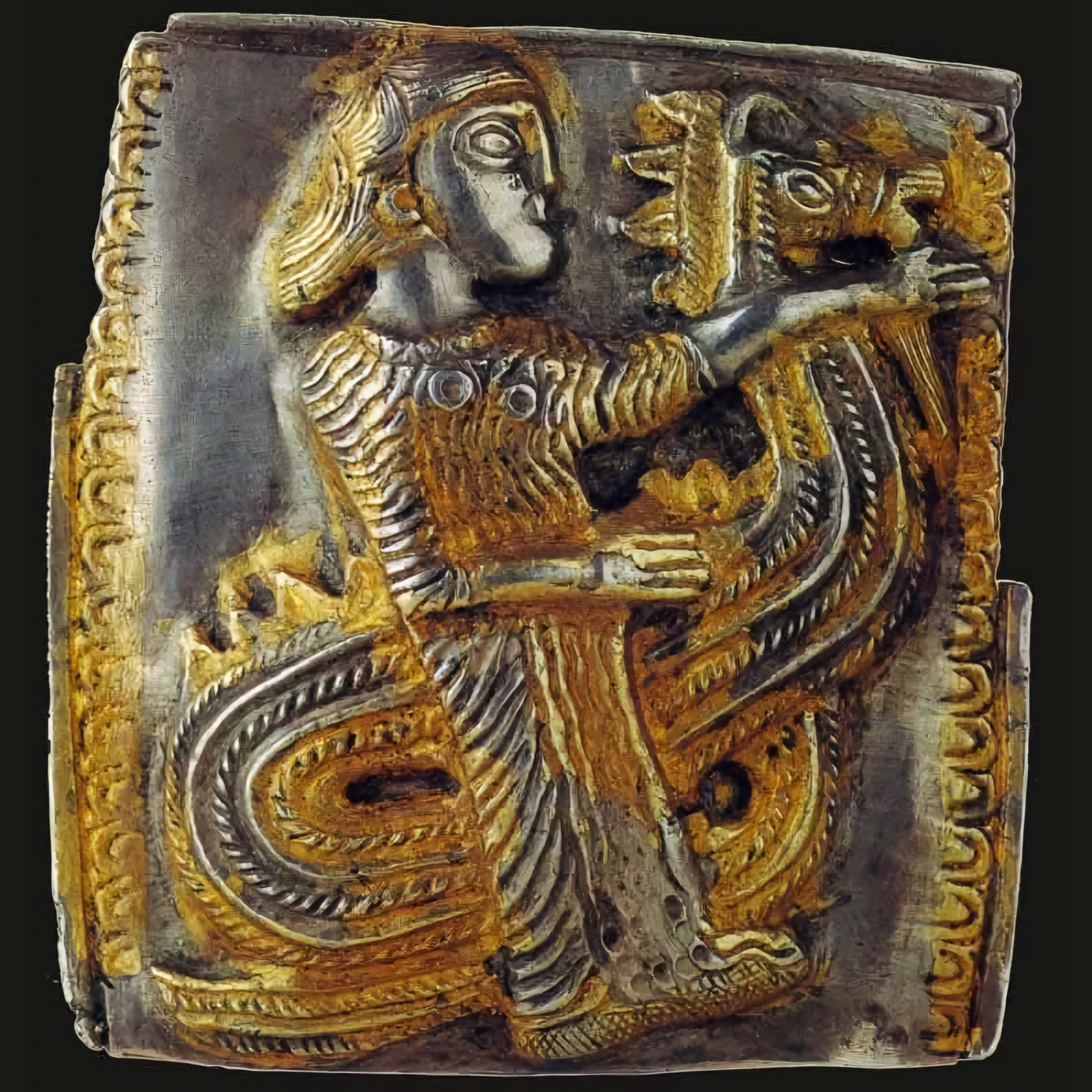 Gilded silver application dated ca 350 BC depicting a Thracian goddess interacting with a dragon or snake.