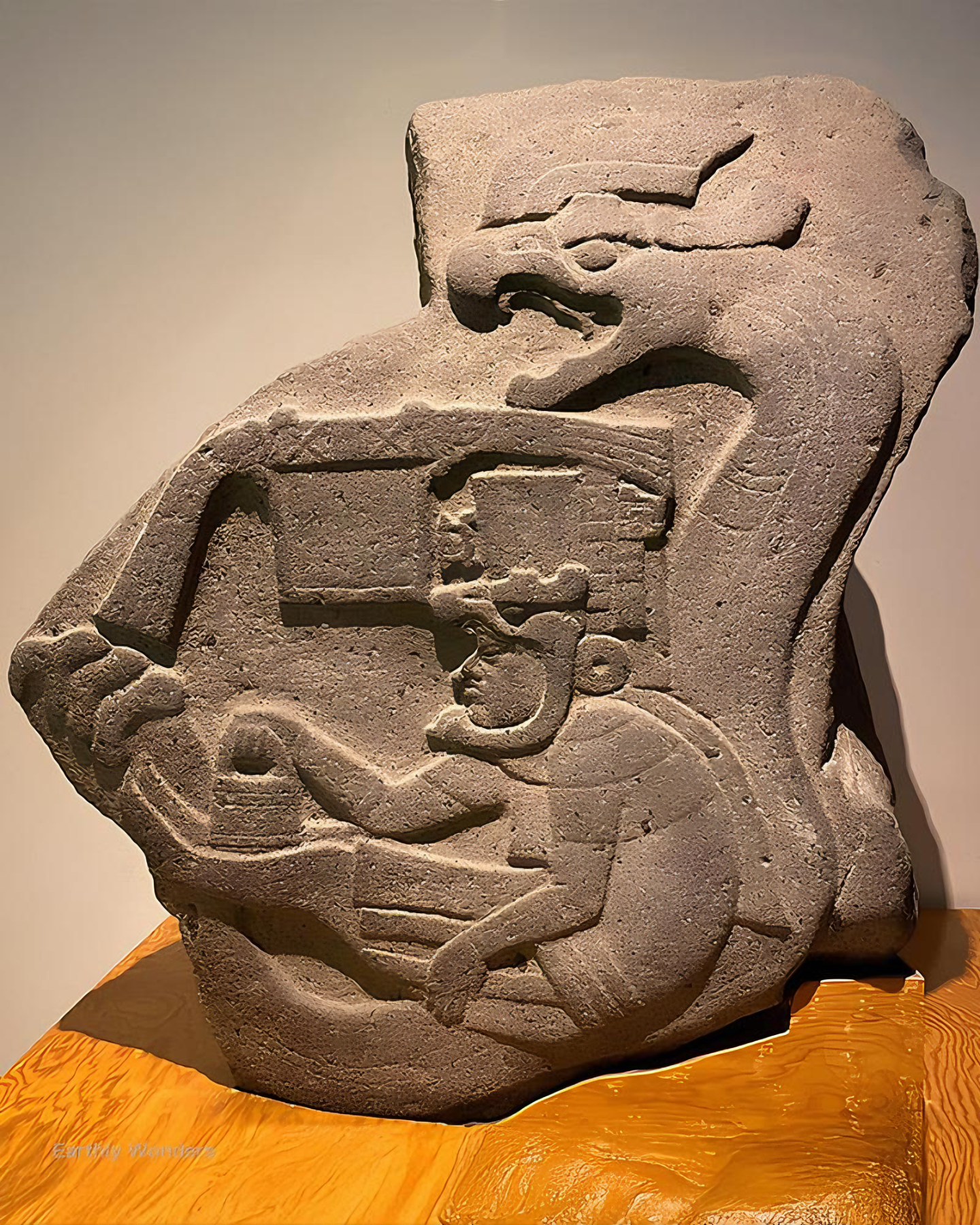 멕시코 타바스코Tabasco 라 벤타La Venta에서 발굴된 이 19번 기념물은 기원전 900년에서 기원전 400년으로 거슬러 올라가며, 올멕 예술 Olmec art에서 가장 오래된 깃털 달린 뱀 묘사를 담았다.