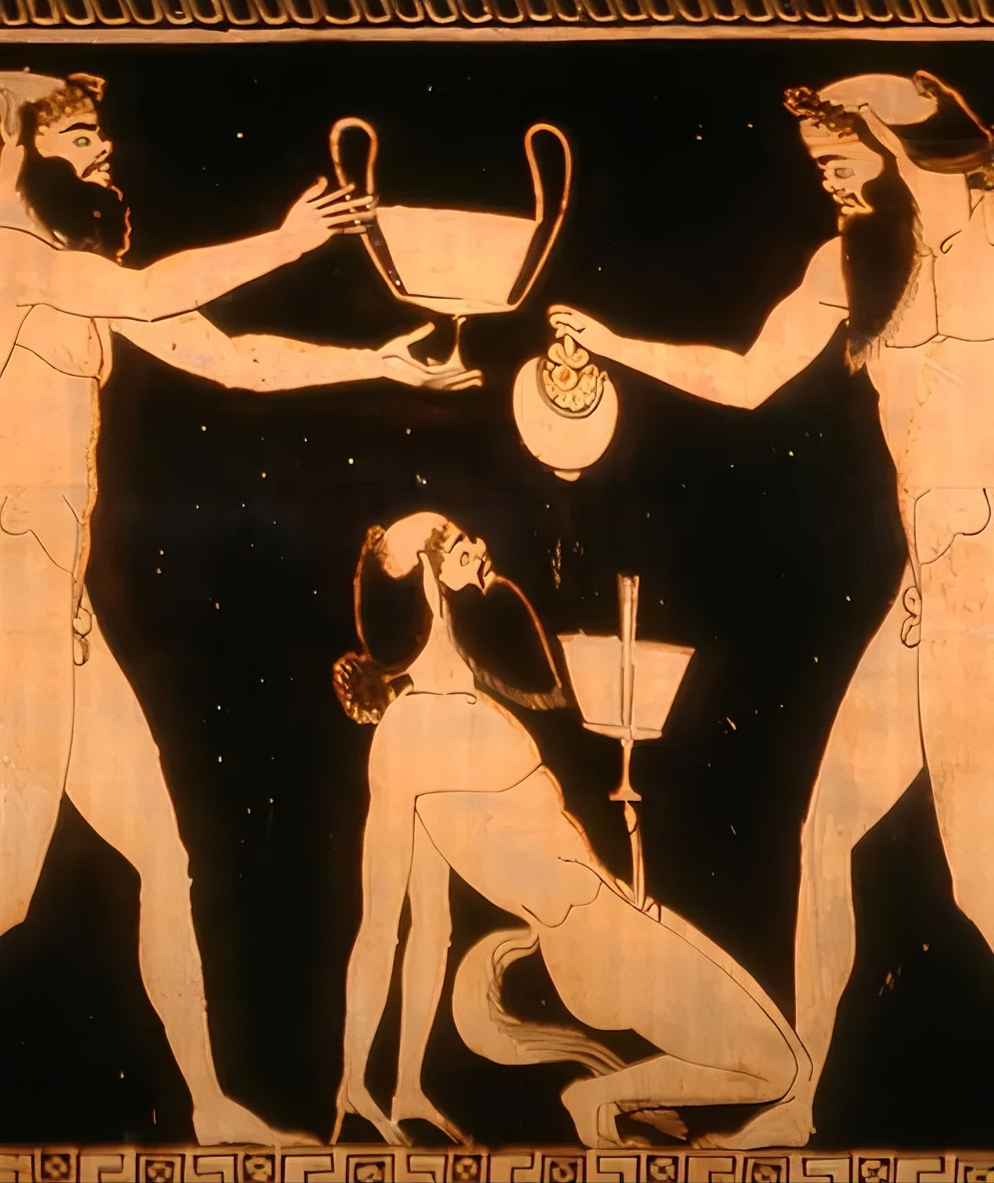 이러한 잔은 그리스 남성들이 술을 마시고 토론하며 술과 철학에 푹 빠지던 심포지엄symposiums, 즉 회의에서 사용되었다. 성, 유머, 그리고 신성함은 금기 없이 공존한다.