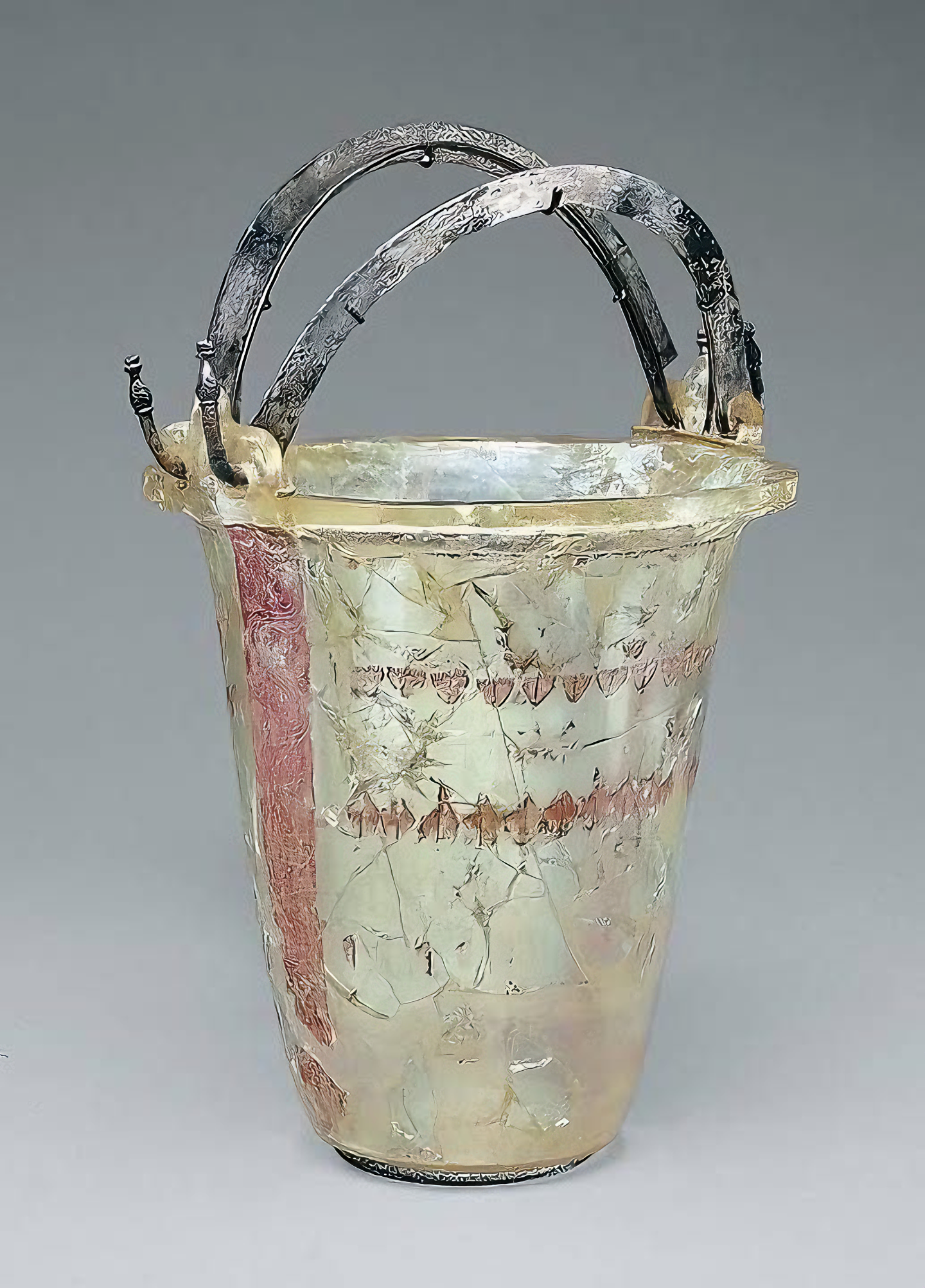 Glass situla (bucket) with silver cast handles from late Classical or early Hellenistic period, 4th-3rd century BC. Greek.