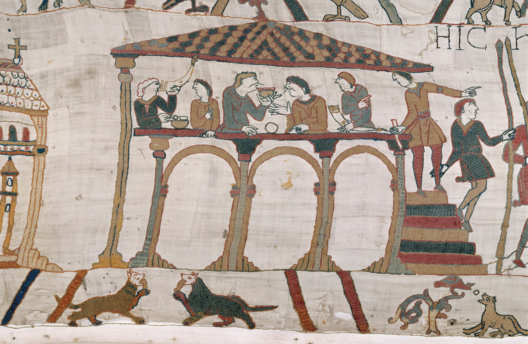 서기 11세기 제작인 길이 70미터(230피트) 리넨 천 linen cloth인 바이유 태피스트리 Bayeux Tapestry는 정복왕 윌리엄William the Conqueror이 영국을 침략하고 1066년 헤이스팅스 전투Battle of Hastings에서 영국의 마지막 앵글로색슨 왕 해럴드 고드윈슨Harold Godwinson을 물리친 장면을 묘사한다.