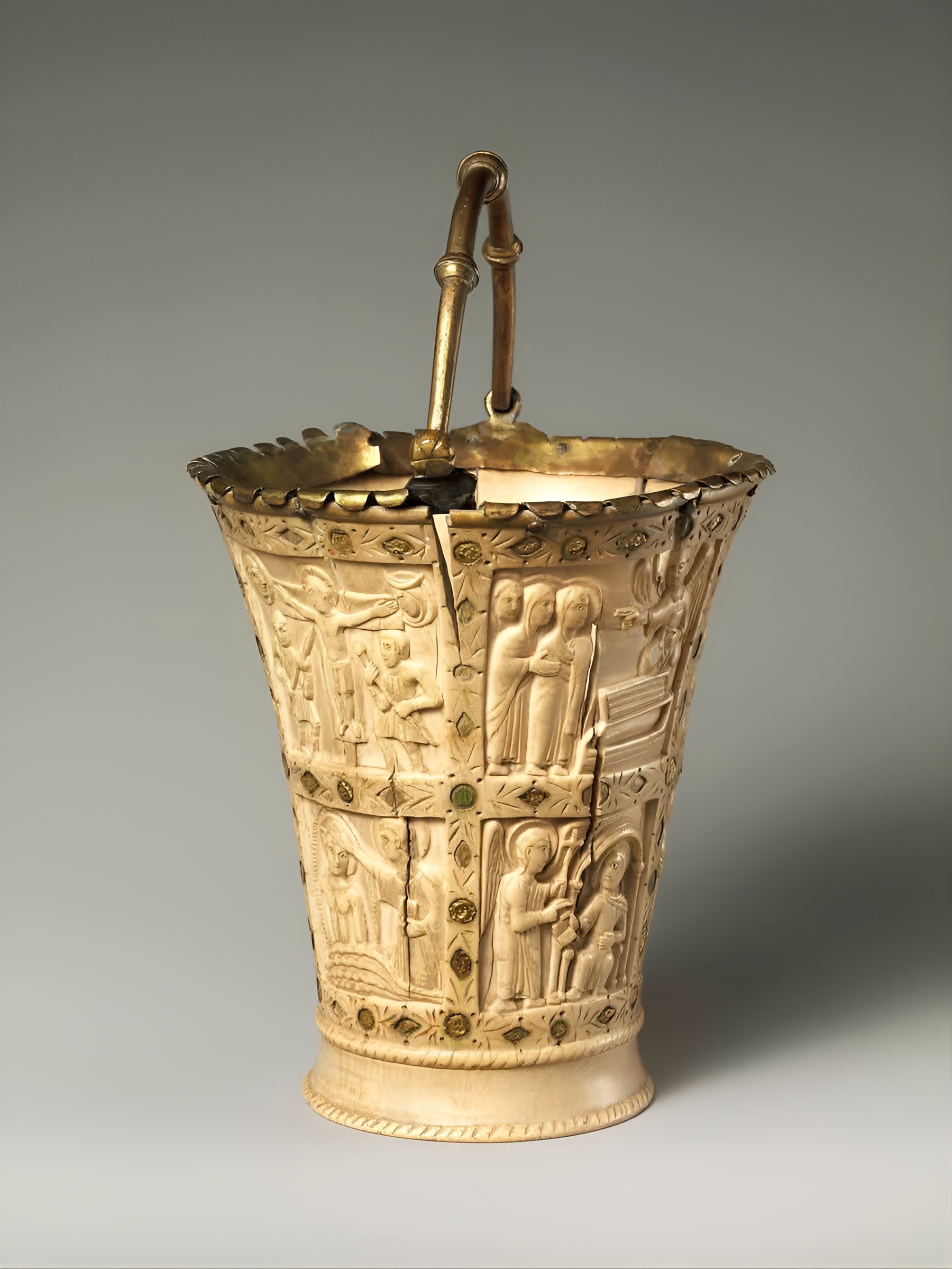 코끼리 상아의 전체 부분을 속이 비게 하고 양동이 표면을 예수의 생애 장면으로 장식했다.
