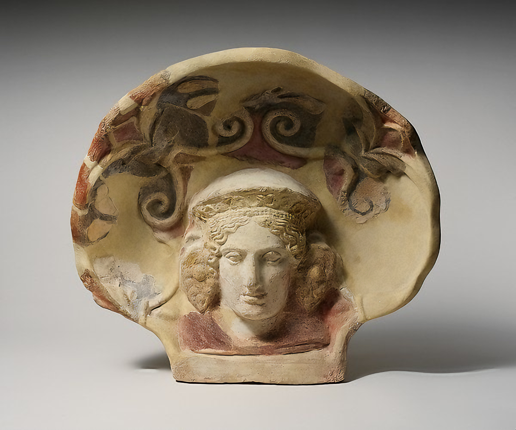 마에나드 머리로 장식한 에트루리아 테라코타 안티픽스
