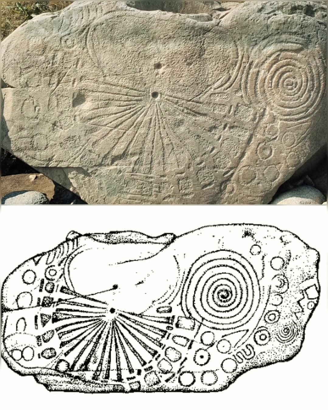 아일랜드 브루 나 보인 계곡 Bru Na Boyne Valley,에 있는 5천년 전 신석기시대 대형 석실 봉토분 노스 무덤 Knowth tomb 호석Kerbstone 중 15번이라는 번호를 부여한 돌에서 드러난 조각이다.