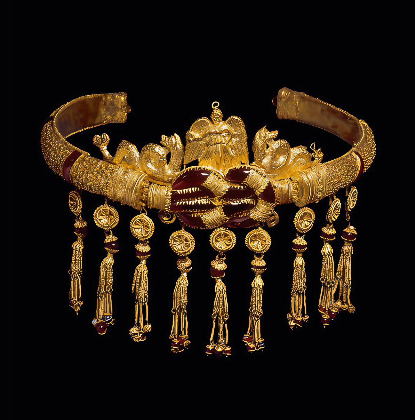 금을 중심으로 가넷garnet, 카넬리언carnelian, 사도닉스sardonyx 같은 준보석을 때려 박아 화려함을 더했다.