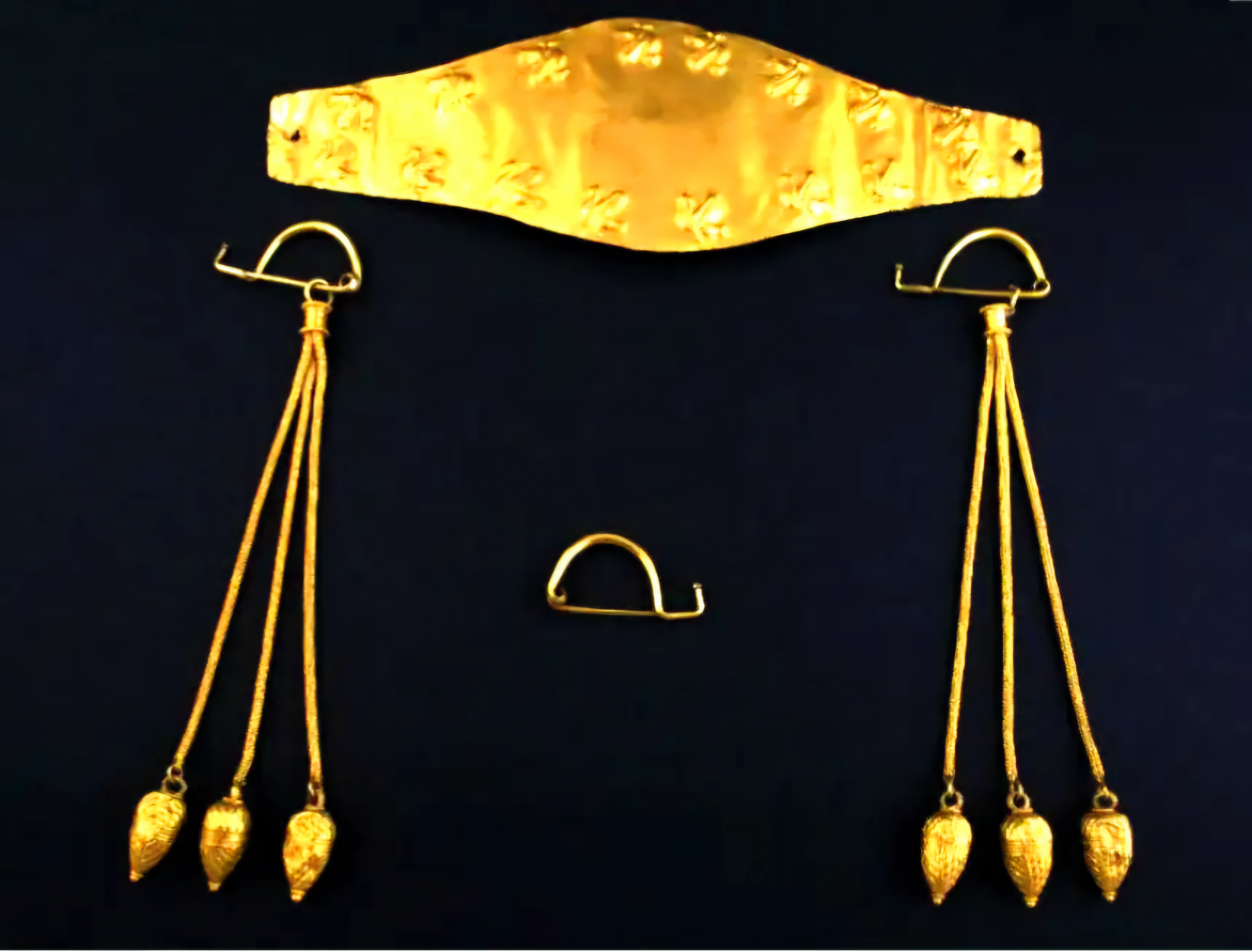 특히, 10개 금 귀걸이는 두개골 주위에 체인으로 배치되어 있다(오른쪽에 7개, 왼쪽에 3개).