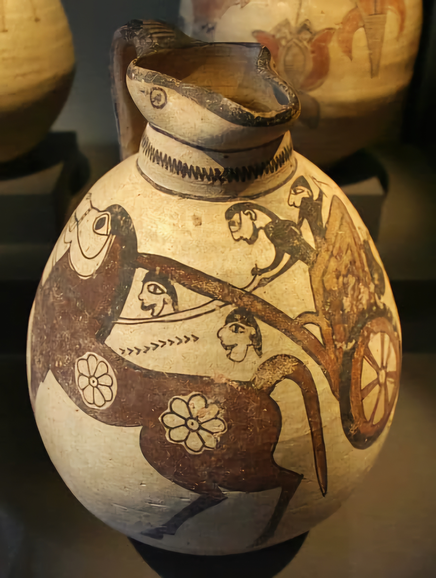 사진 속 아름다운 문양을 장식한 이 도기 주전자는 다양한 지역의 특정 유형의 미케네 도기와 매우 유사하다.