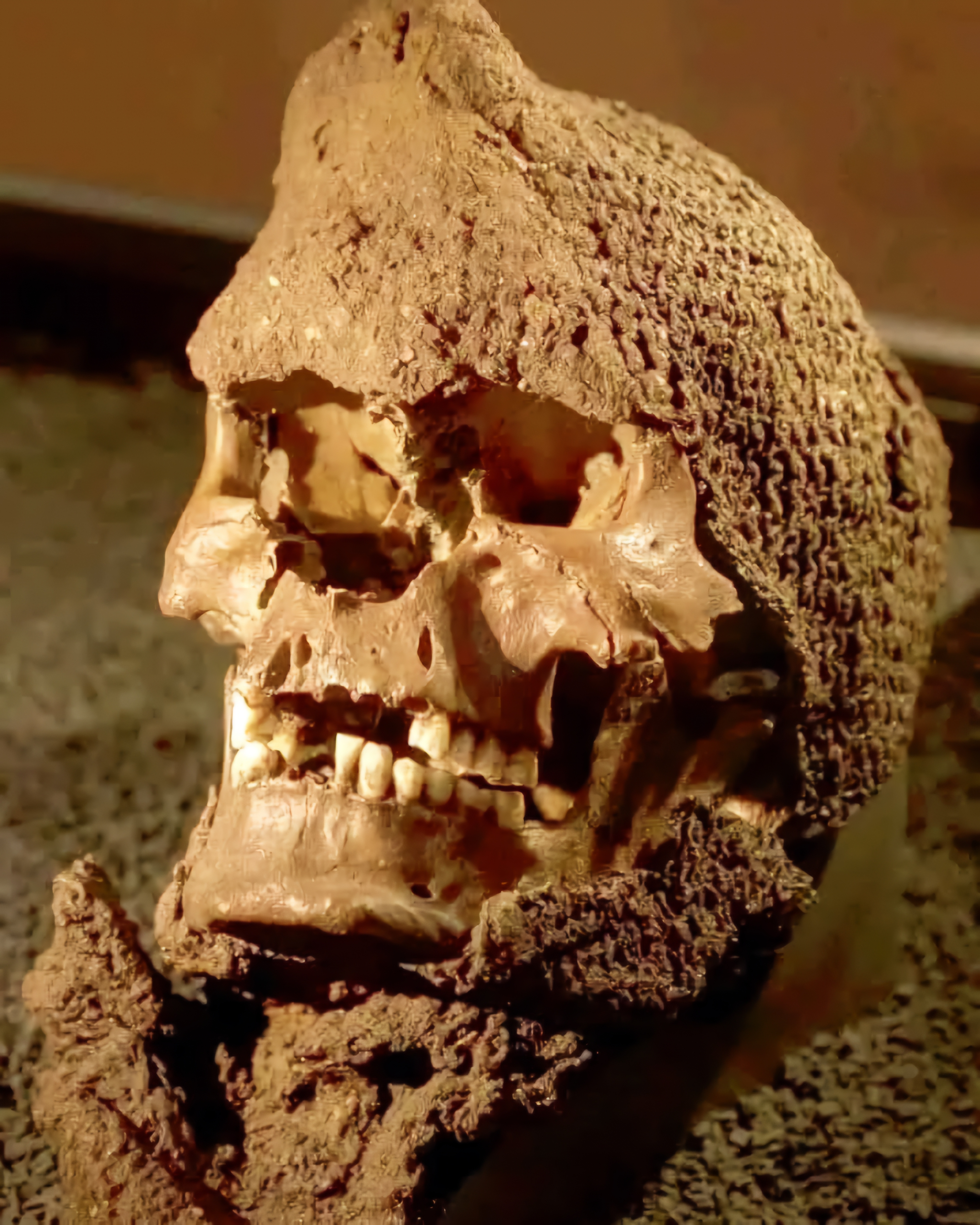 Skull wearing a medieval chainmail from a mass grave on the Island of Gotland, Sweden.