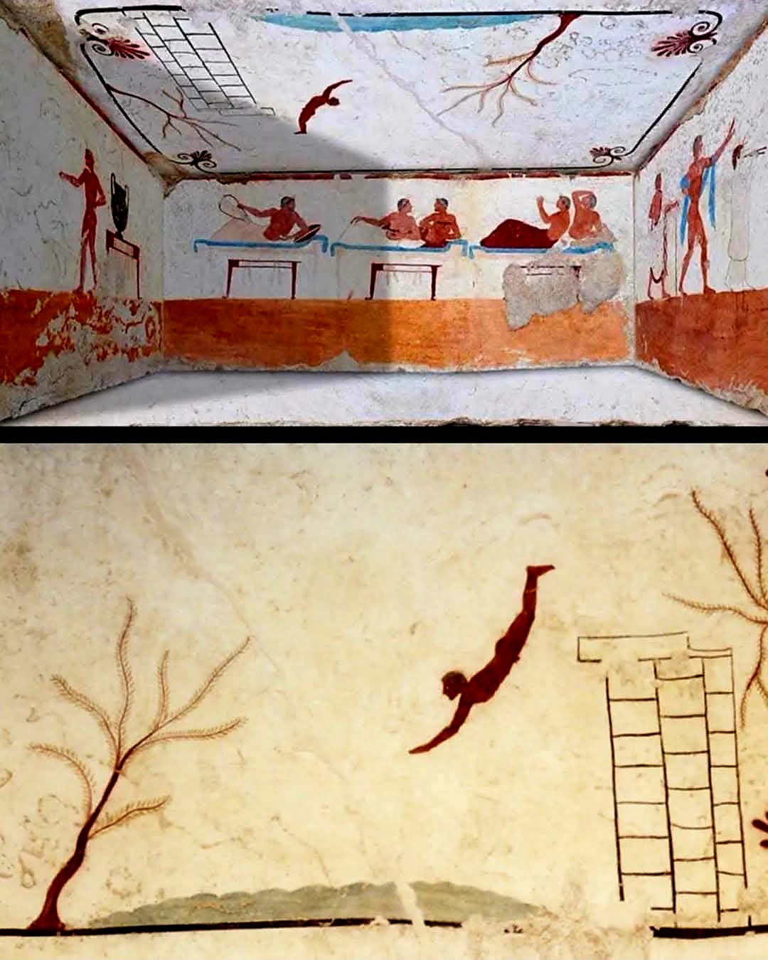 현재는 이탈리아 파에스툼Paestum 박물관에 있는 다이버 무덤 Tomb of the Diver(톰바 델 투파토레 Tomba del tuffatore)이다.