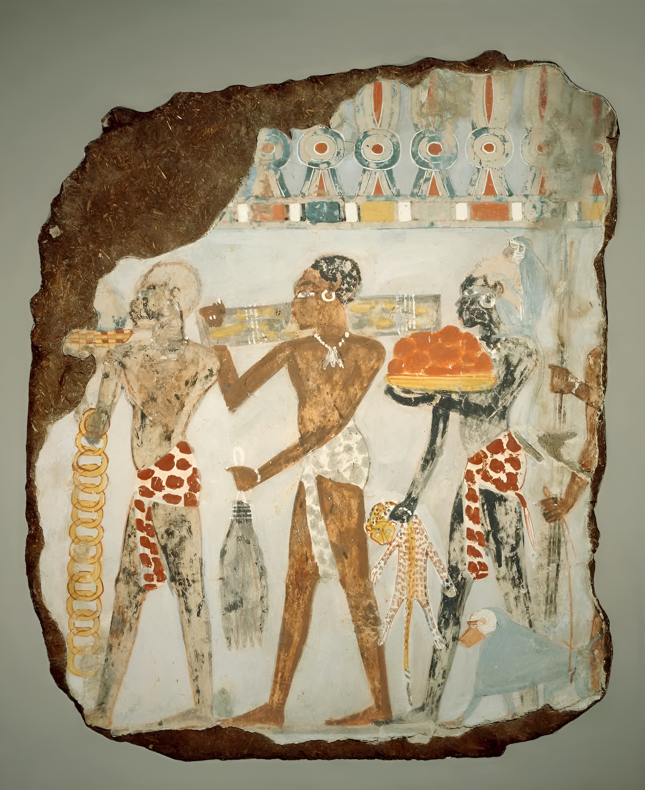 금, 표범 가죽, 재스퍼jasper와 같은 공물을 바치는 누비아인들Nubians을 묘사한 이집트 회화다.