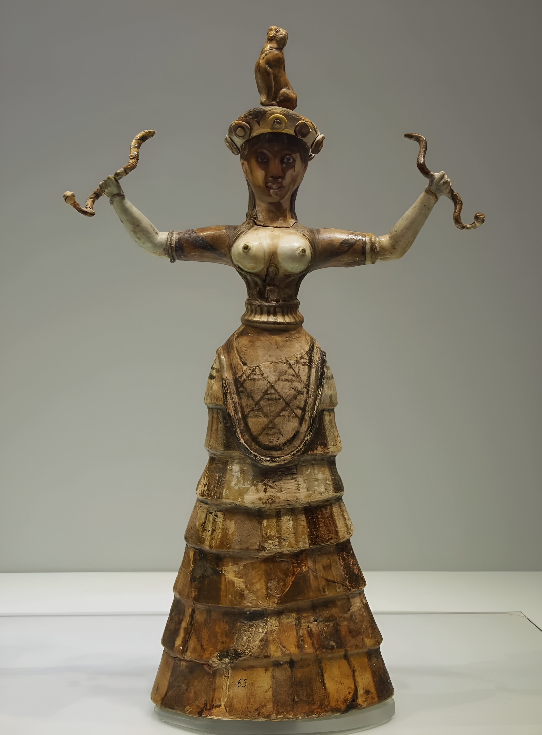 1903년 그리스 크레타 섬 크노소스Knossos에 있는 미노아 궁전에서 두 개 미노아 뱀 여신 조각상 Minoan snake goddess figurines이 발굴되었다.