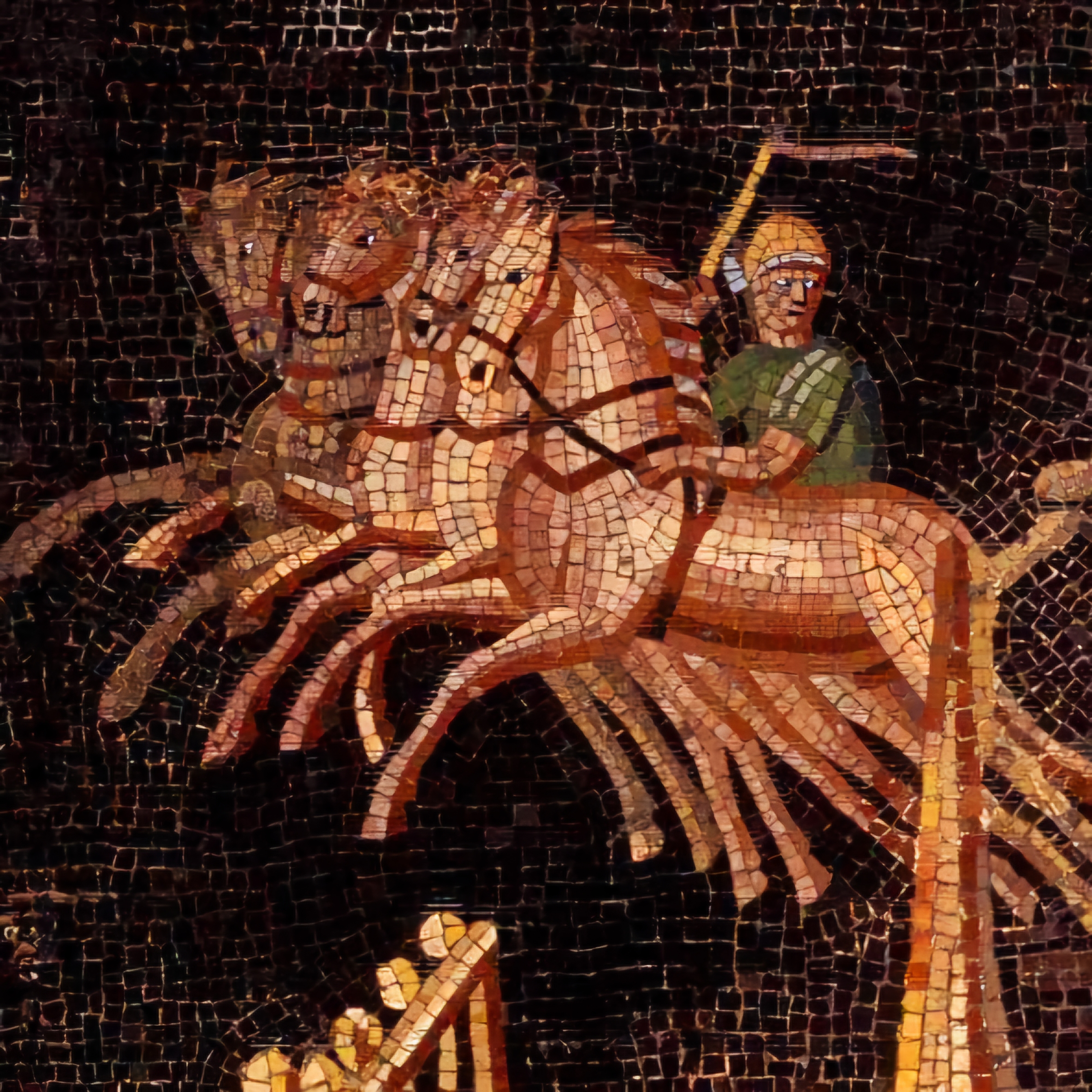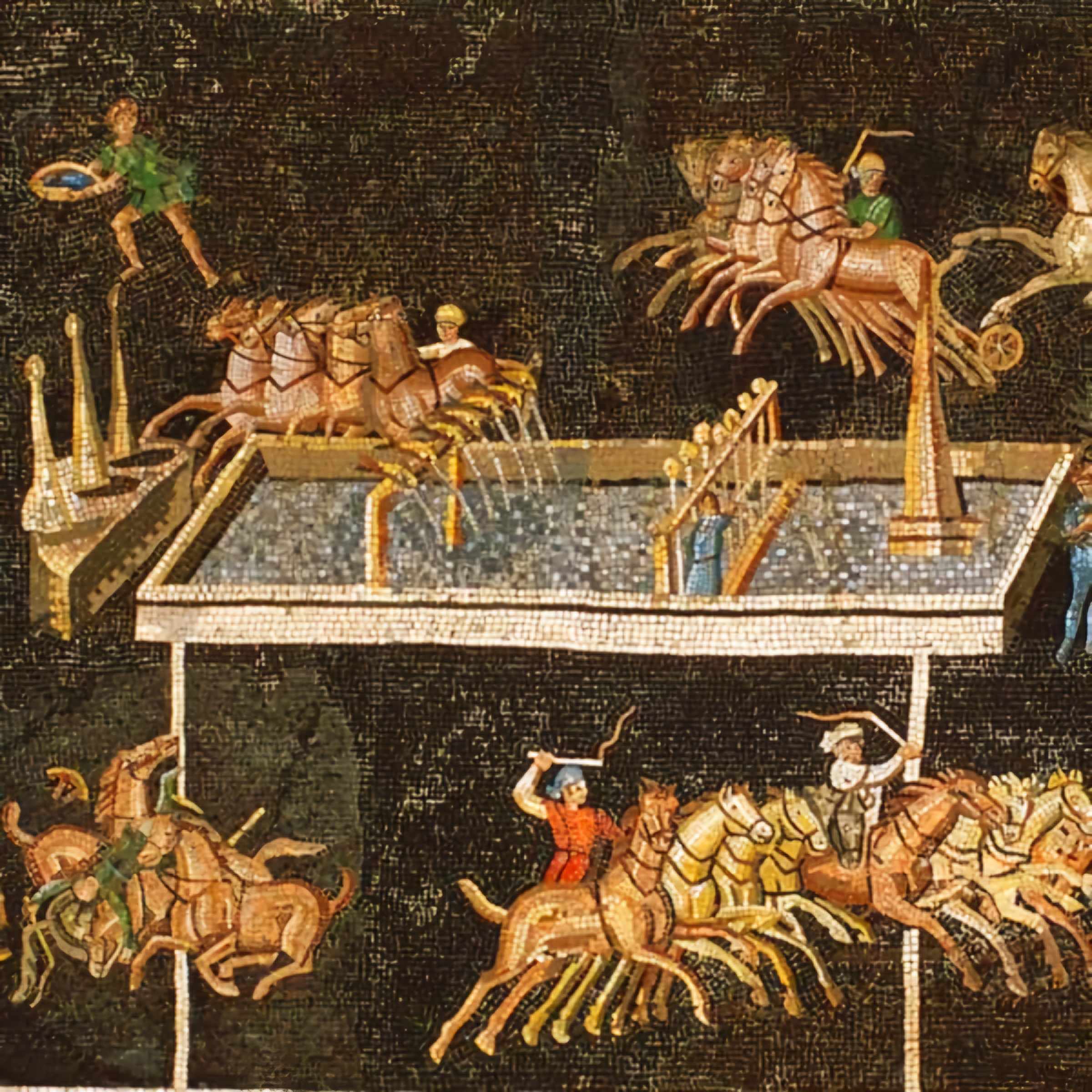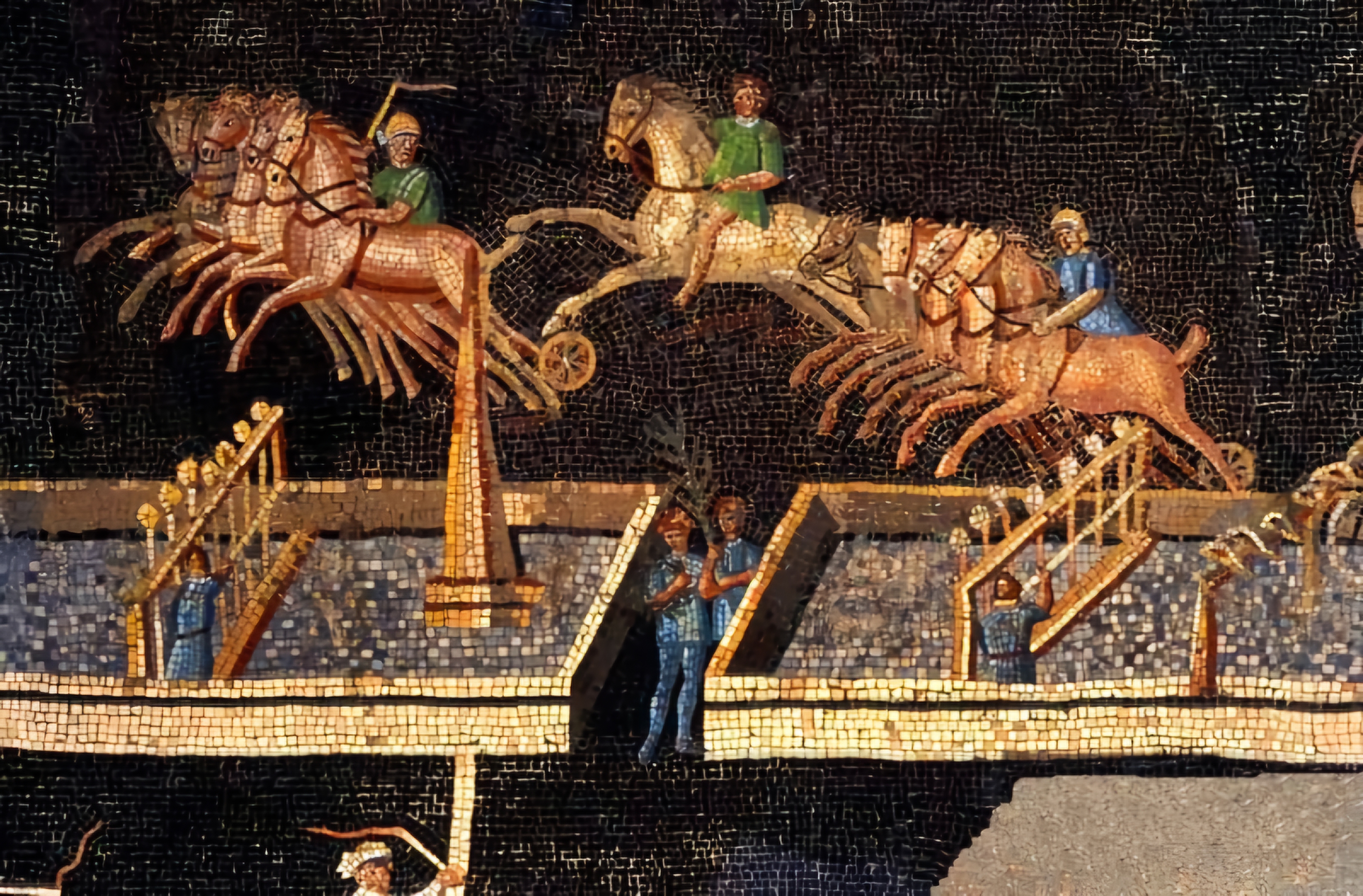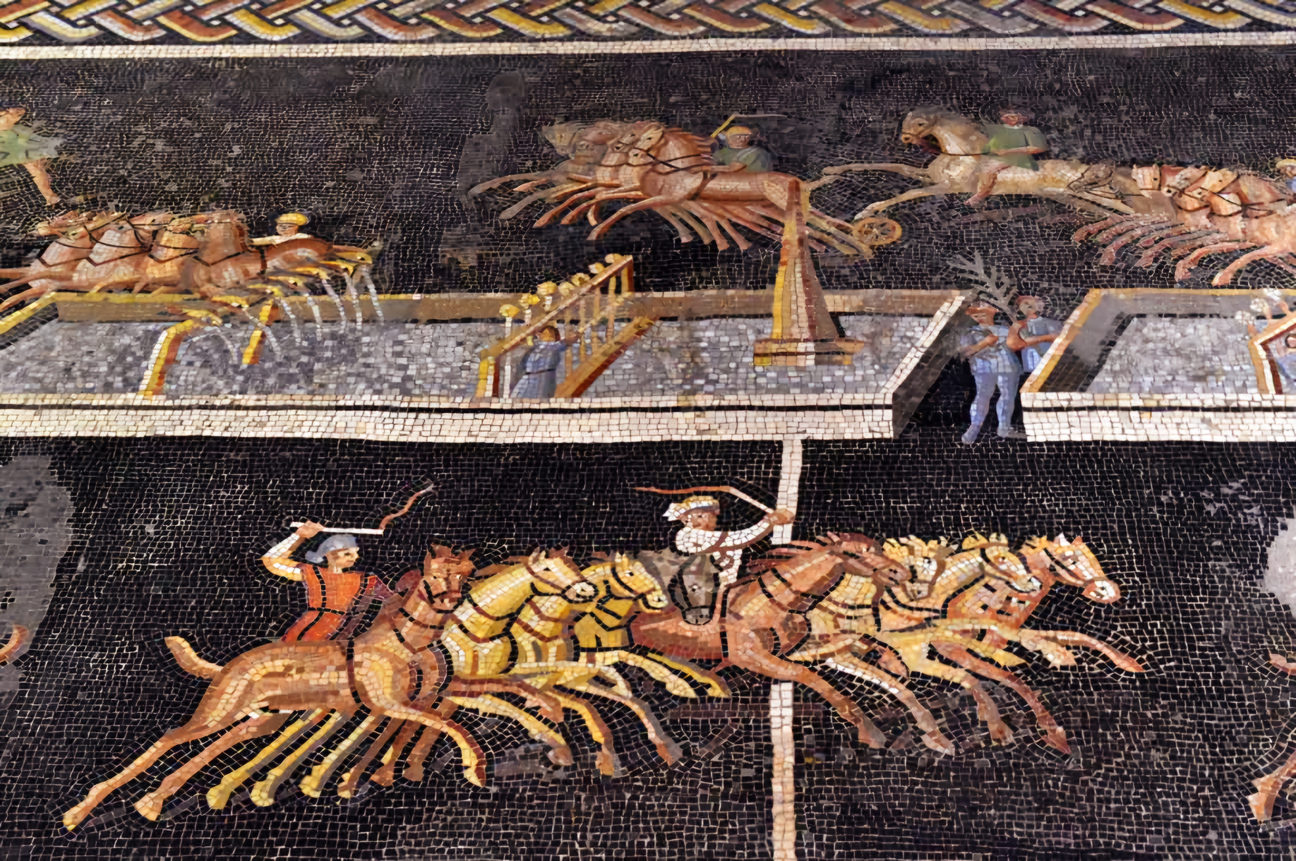 로마 시대 전차 경주 chariot race 를 생생히 묘사한 로마시대 이른바 서커스 게임 모자이크화 Circus Games Mosaic다.
