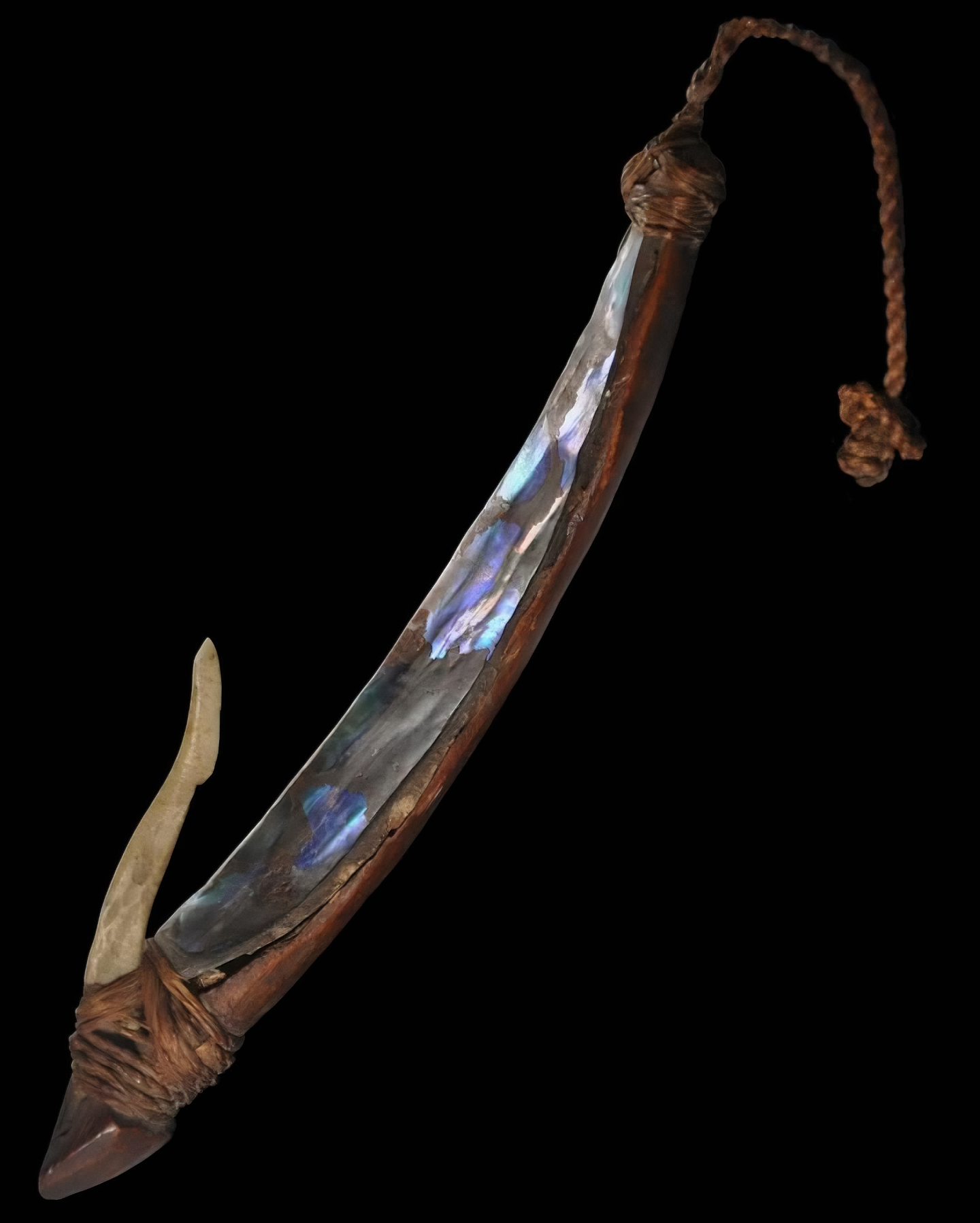 광택 나는 할리오티스haliotis 또는 파우아 껍질aua shell을 곡선형 나무 생크wooden shank에 부착한 조각과 뼈를 깎아 만든 긴 미늘 barb이 그것이다.
