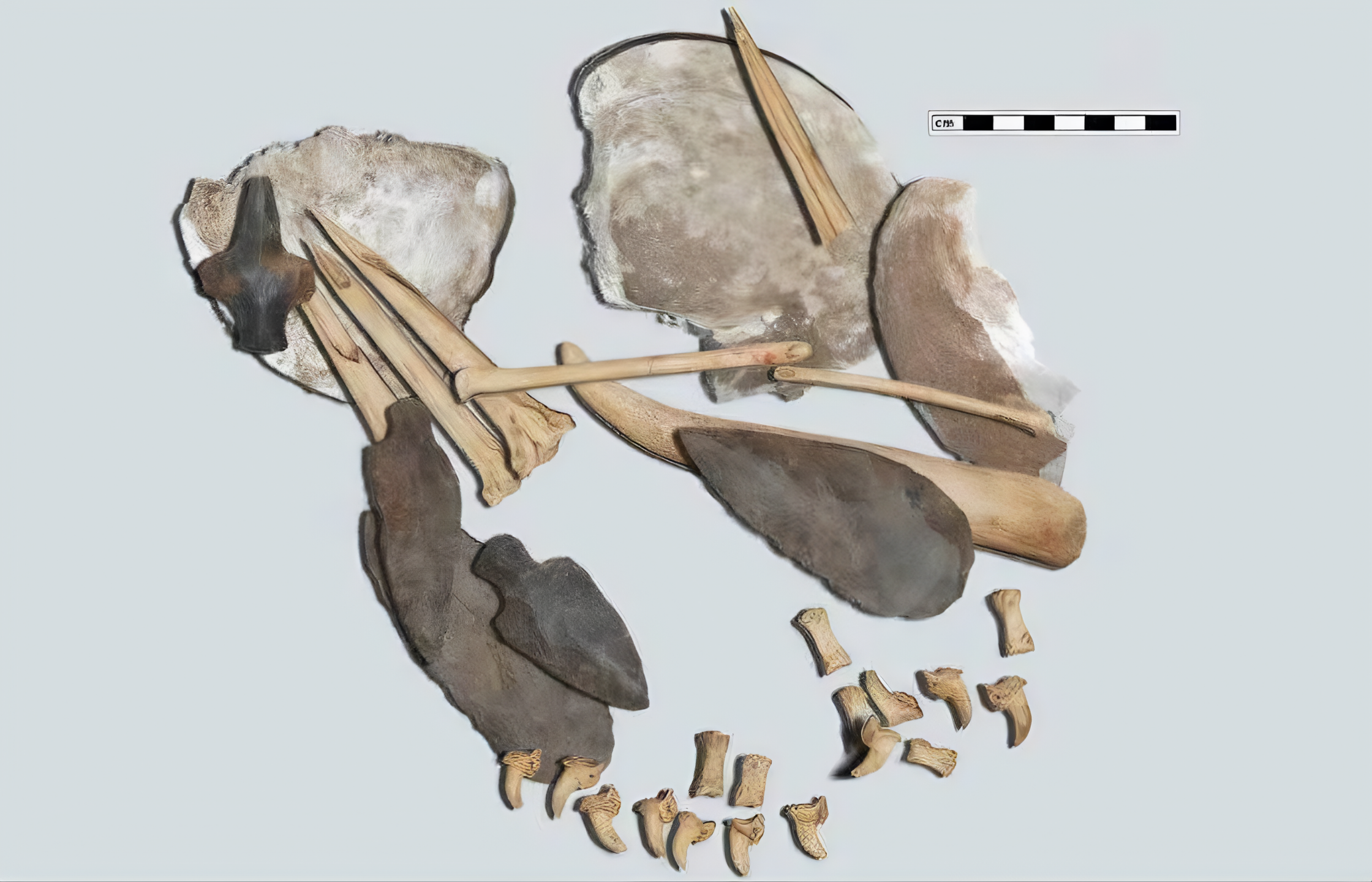 개과 동물 피부로 싸여 있었고 붉은 색소 흔적이 있는 날카로운 칠면조 뼈와 홍합 껍질로 구성되어 있다.