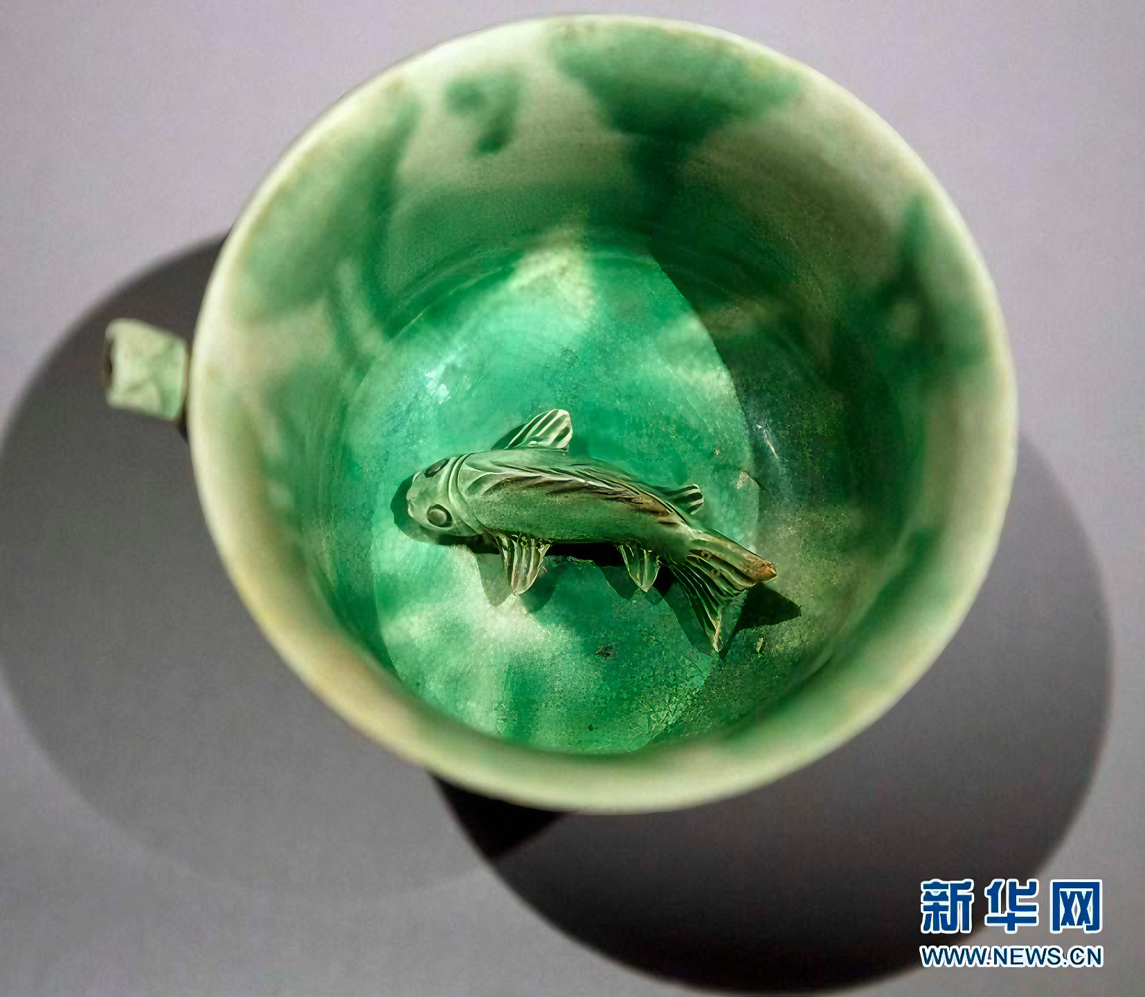 A Tang dynasty green-splashed cup with 3-dimensional fish at the bottom, recovered from the Belitung shipwreck, which is the the wreck of an Arabian dhow which sank around 830 CE on its return from China. Now on display at the Asian Civilisations Museum in Singapore