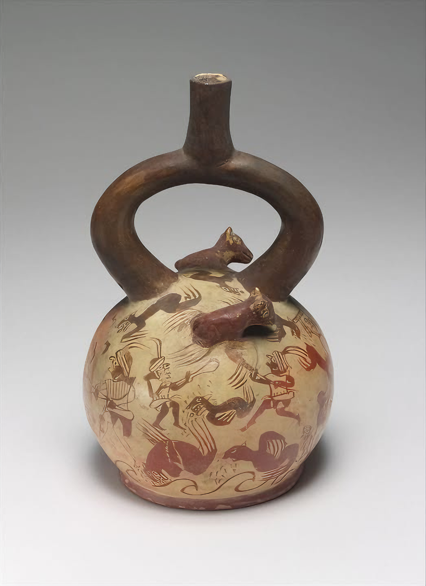 바다사자 사냥 병, 연대: 서기 6~7세기, 페루, 모체 문화, 세라믹, H. 9 × Diam. 5 1/4인치(22.9 × 13.3cm)