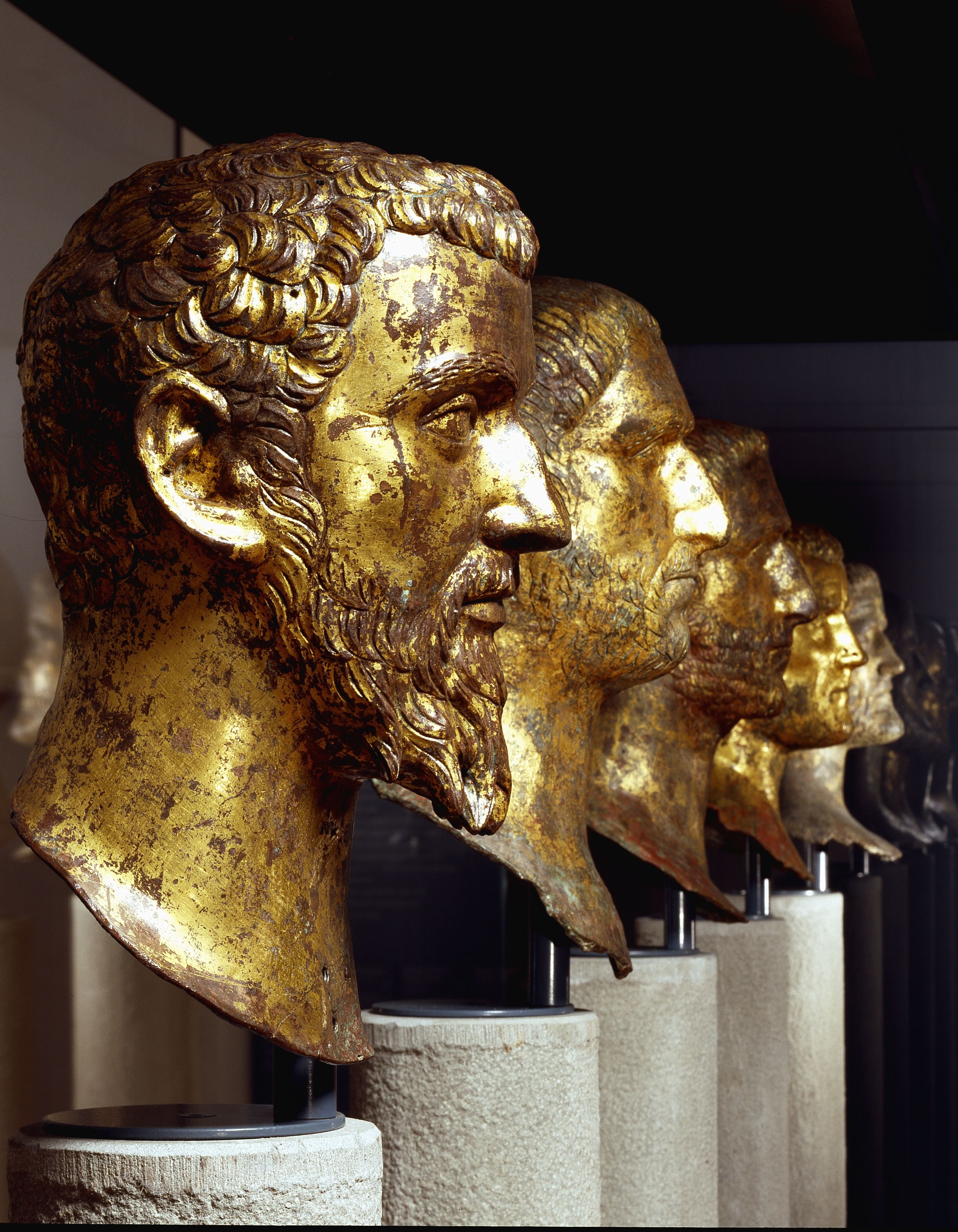 5 Roman gilt bronze portraits of emperors: Septimius Severus, Probus x2, and Claudius Gothicus x2, found in the temple of the Capitoline Triad in Brescia, now on display in the Santa Giulia Museum, Brescia, Italy.