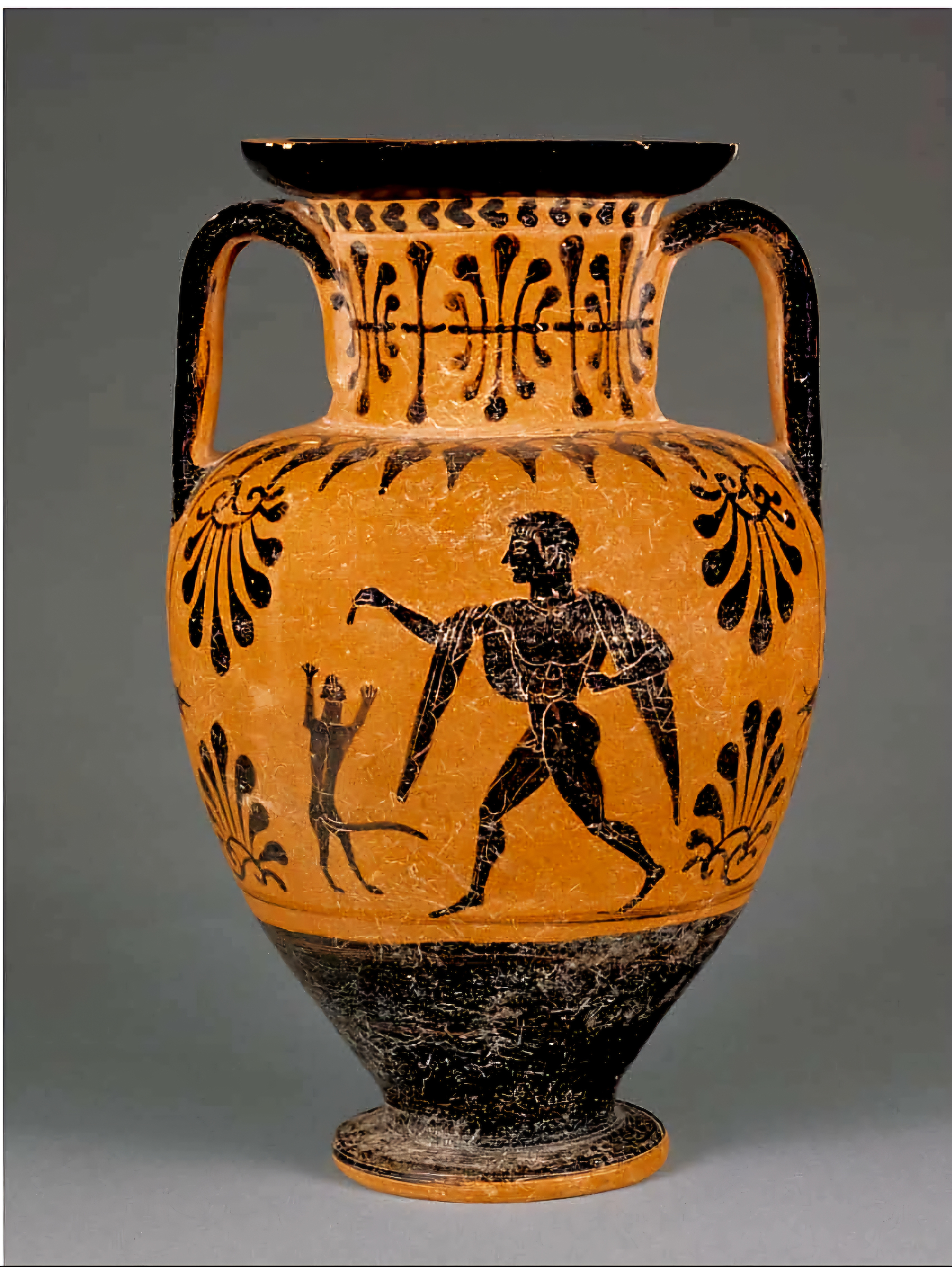 이 에트루리아 암포라는 나체 청년이 긴꼬리고양이long-tailed cat를 위해 한 조각 먹이를 들고 있는 모습을 보여준다.