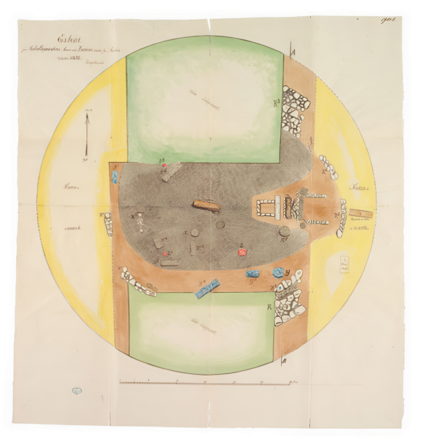 발굴 평면도에는 또한 정사각형 돌로 된 두 개 석조물이 포함되어 있다.
