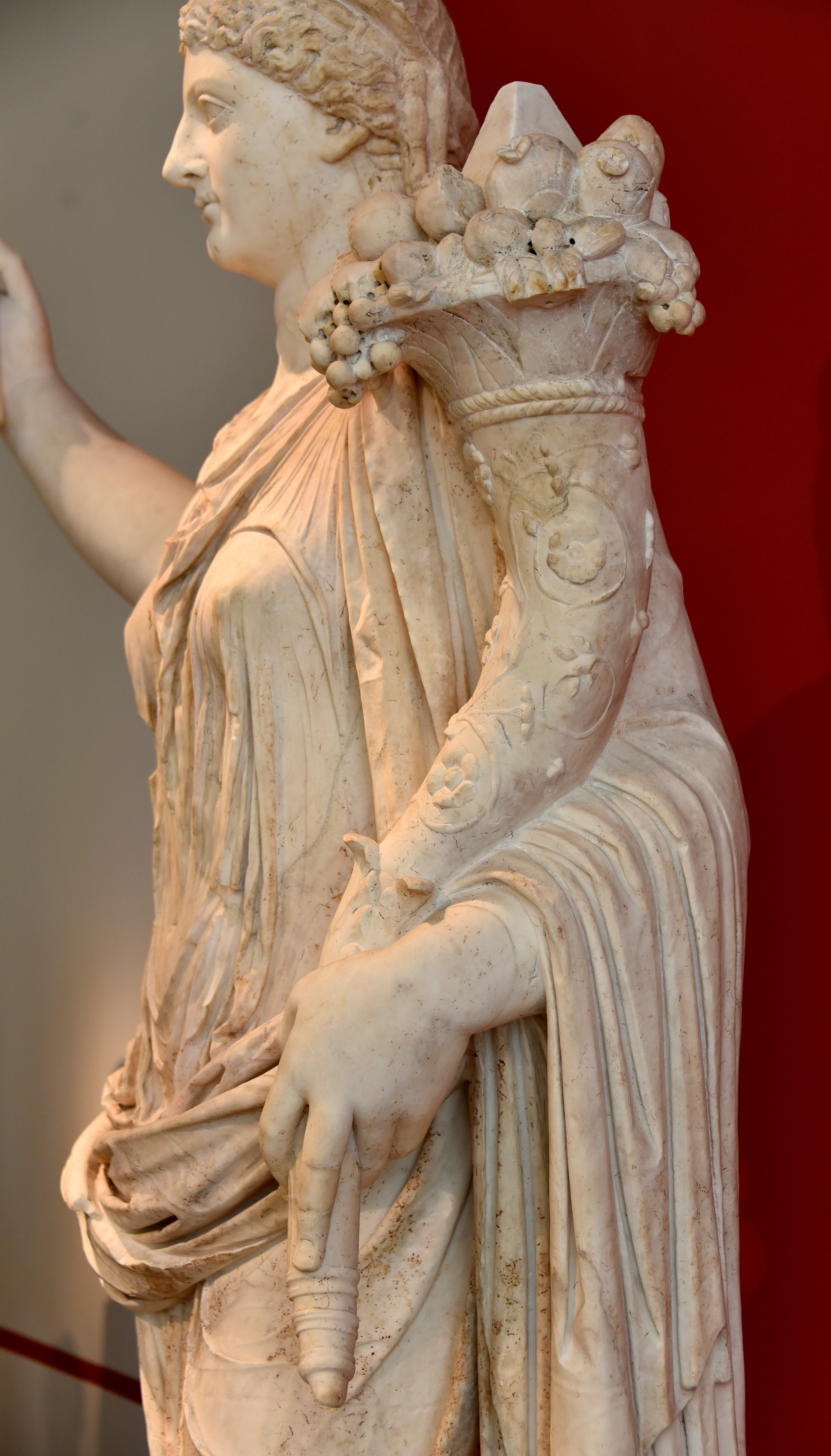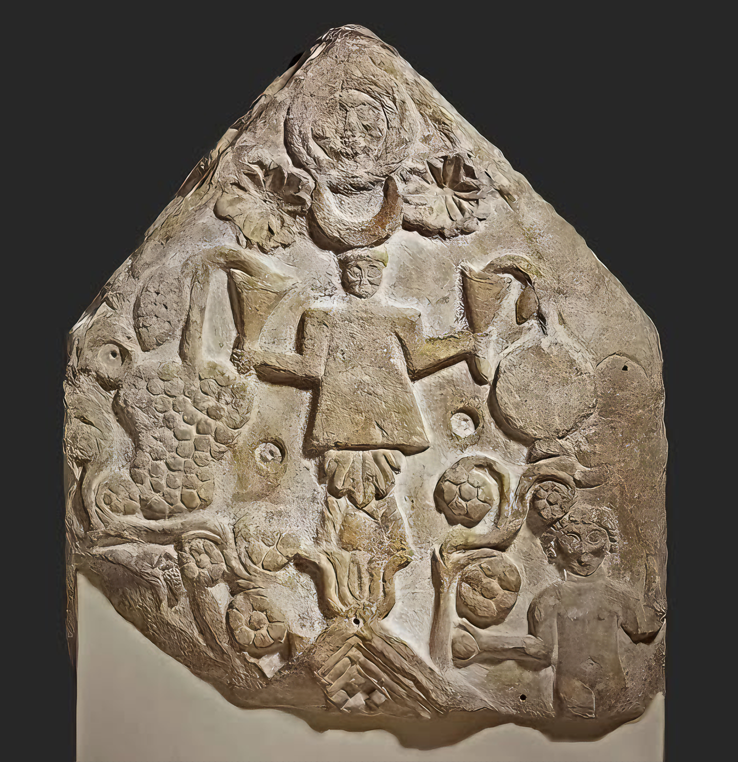 Limestone stele depicting the goddess Tanit with cornucopias bearing grapes and pomegranates. Carthage. Circa 300–200 BC.