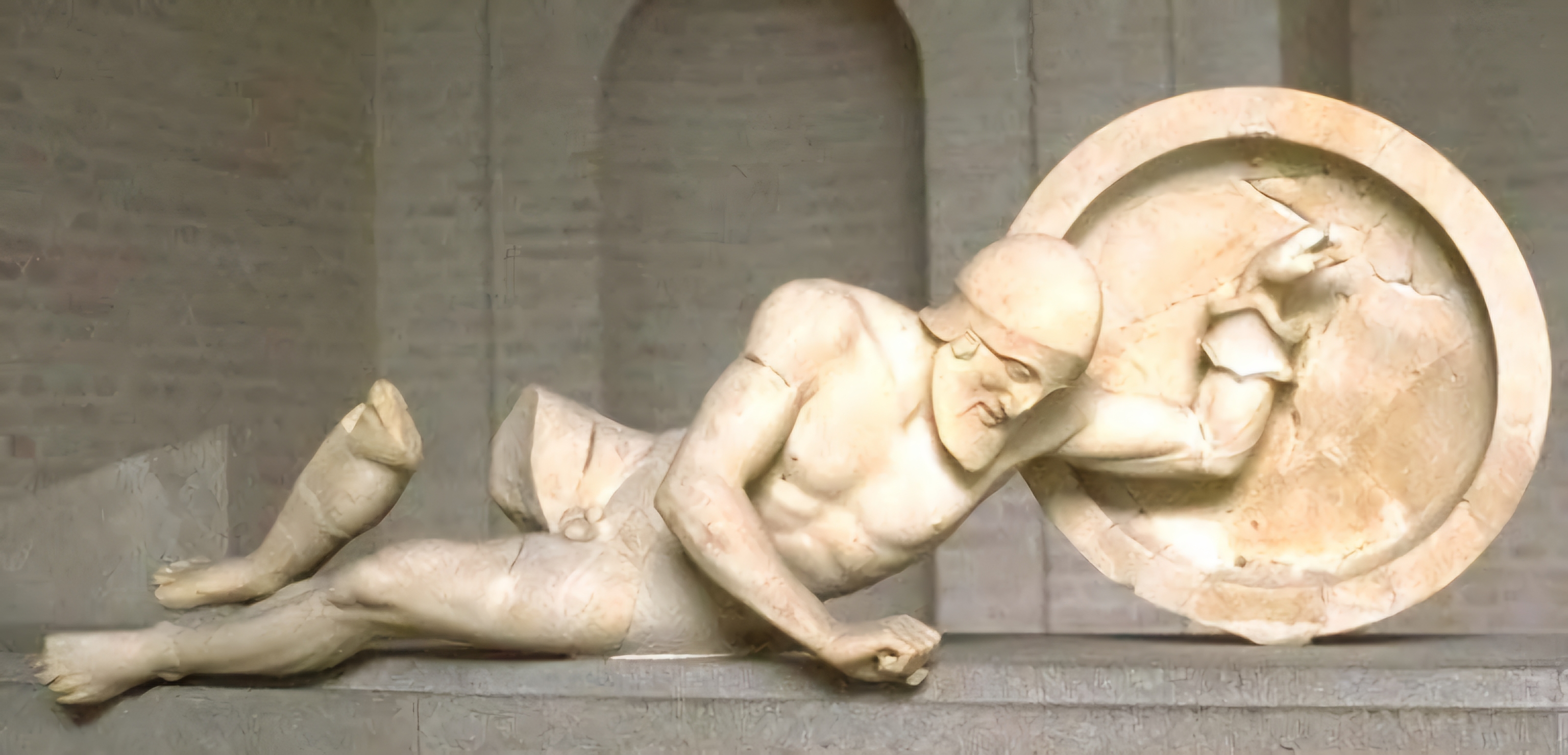 이 이미지는 아이기나Aegina(기원전 490~480년)에 있는 아테나 아파이아 신전 Temple of Athena Aphaia 동쪽 페디먼트pediment를 장식한 죽어가는 전사 조각이다.