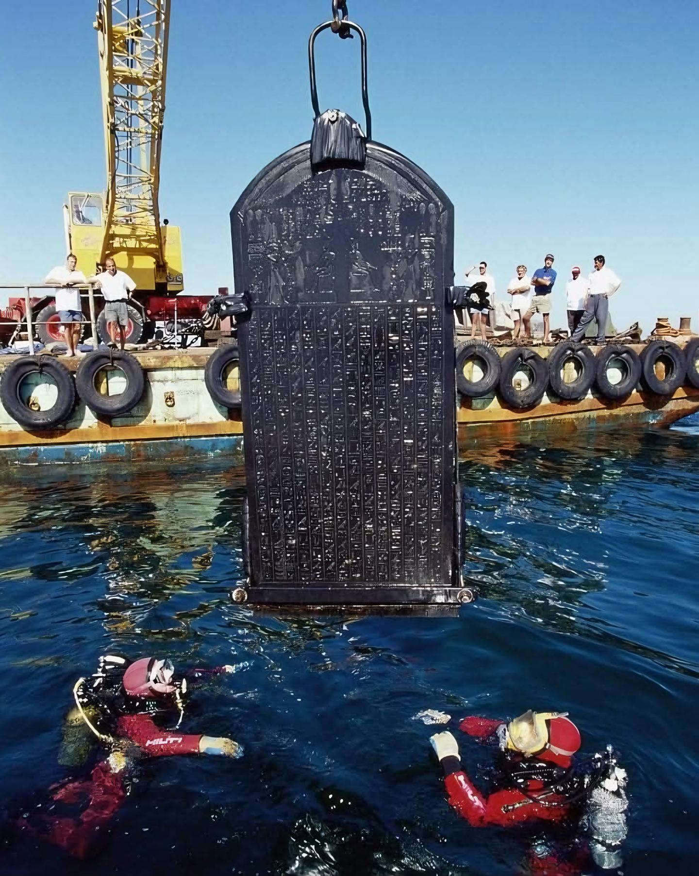 이집트 해안에 침몰한 항구 도시 토니스 헤라클레이온Thonis Heracleion 폐허에서 석비를 들어올리는 중이다.